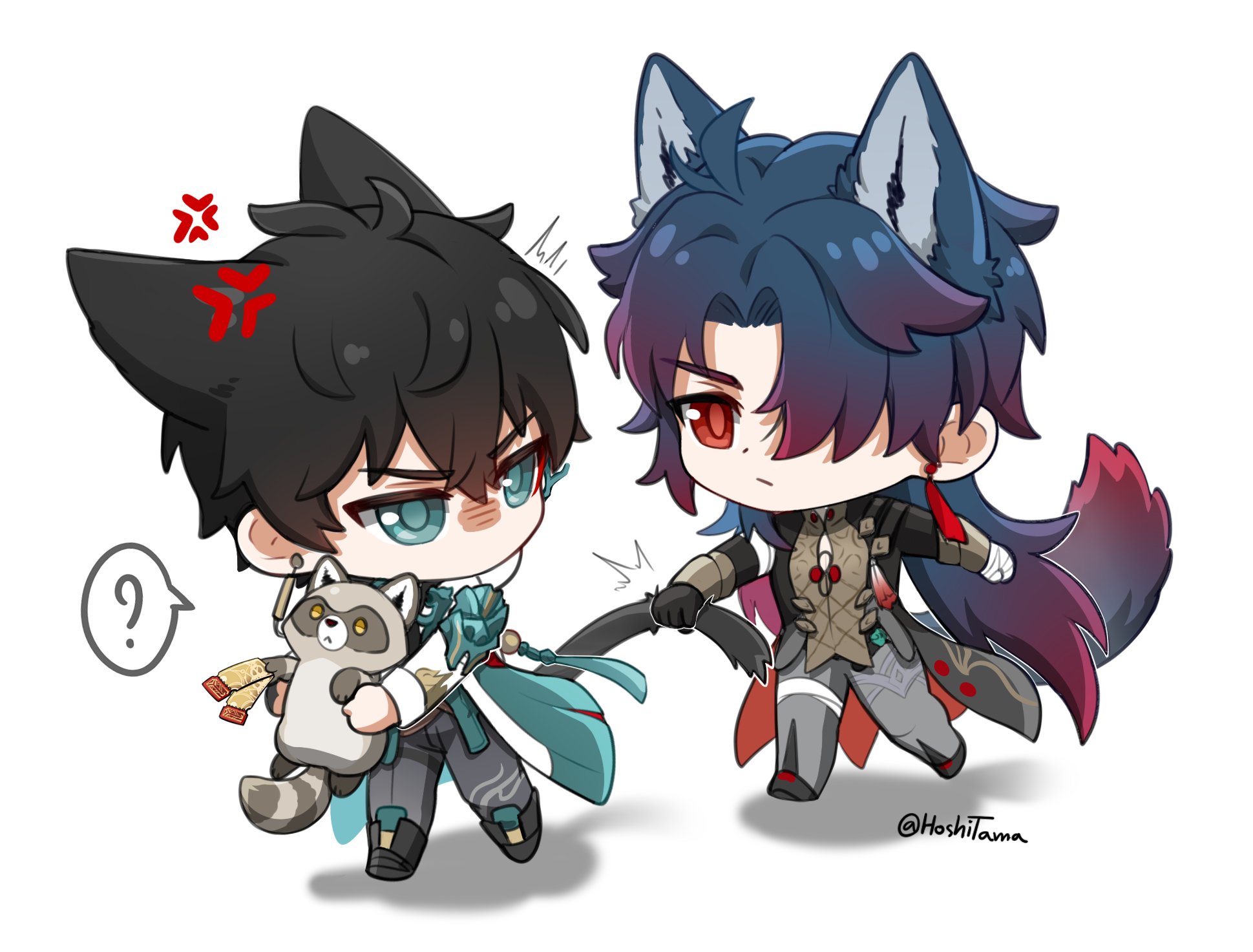 2boys ? anger_vein animal animal_ears antenna_hair bandaged_hand bandages black_footwear black_hair black_sleeves blade_(honkai:_star_rail) chibi chinese_clothes closed_mouth dan_heng_(honkai:_star_rail) full_body green_eyes grey_pants hair_over_one_eye highres holding holding_animal honkai:_star_rail honkai_(series) hoshikuroyoru long_hair looking_at_another multiple_boys no_mouth pants parted_bangs raccoon red_eyes speech_bubble standing tail tail_grab ticket v-shaped_eyebrows white_sleeves