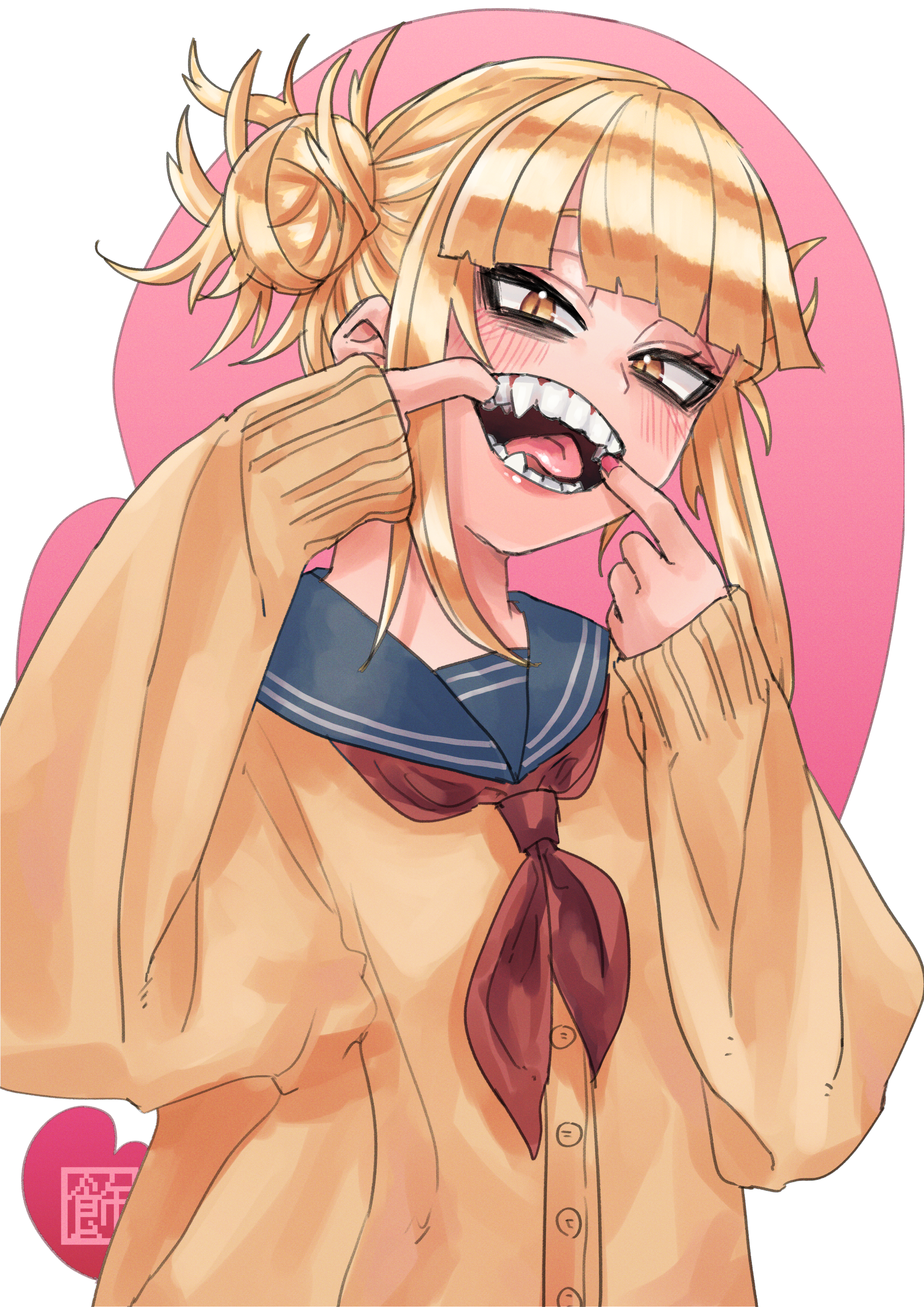 1girl absurdres blonde_hair blunt_bangs blush boku_no_hero_academia cardigan double_bun fangs hair_bun highres kazari_kabocya messy_hair open_mouth school_uniform serafuku sidelocks slit_pupils solo toga_himiko upper_body yellow_eyes