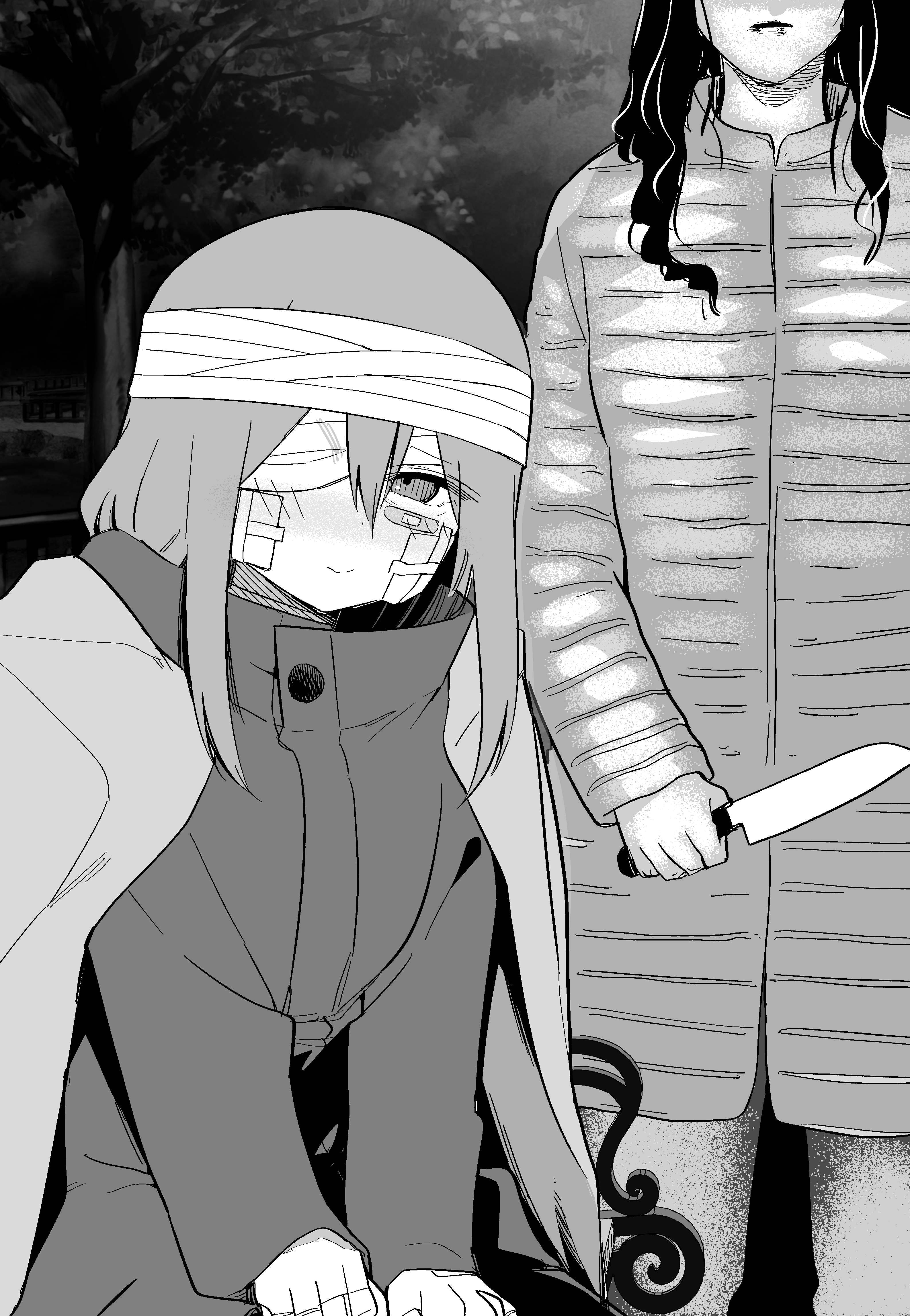 1girl 2girls absurdres bandage_over_one_eye bandaged_head bandages bandaid bandaid_on_cheek bandaid_on_face bandaid_on_hand bench bruise bruised_eye greyscale highres holding holding_knife hood hoodie impending_doom injury jacket kitchen_knife knife kuga_tsuniya long_hair long_sleeves monochrome mother_and_child mother_and_daughter multiple_girls night on_bench open_clothes open_jacket original outdoors parent_and_child park park_bench sidelocks sitting smile standing