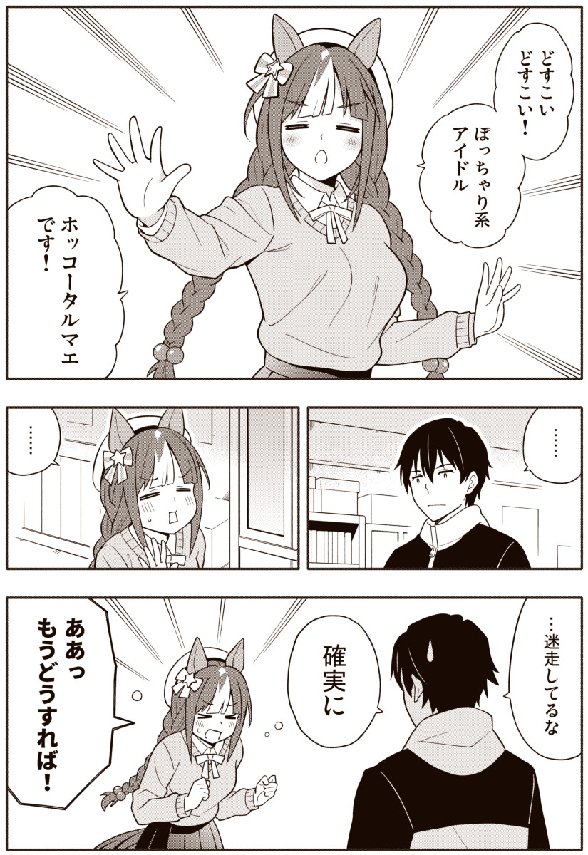 ... 1boy 1girl =_= alternate_costume amasawa_natsuhisa animal_ears beret blush braid breasts casual clenched_hands closed_mouth commentary_request emphasis_lines hair_ornament hair_ribbon hat highres hokko_tarumae_(umamusume) horse_ears long_braid medium_breasts monochrome open_mouth ribbon trainer_(umamusume) translation_request twin_braids umamusume