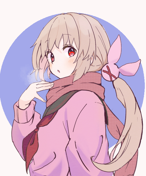 >_< 1girl :o black_sailor_collar blush breath commentary from_side hair_ornament hand_up light_brown_hair long_hair long_sleeves looking_at_viewer natori_sana natori_sana_(school_uniform) neckerchief open_mouth pink_sweater rabbit_hair_ornament red_eyes red_neckerchief red_scarf sailor_collar sana_channel scarf solo sweater upper_body virtual_youtuber youasato