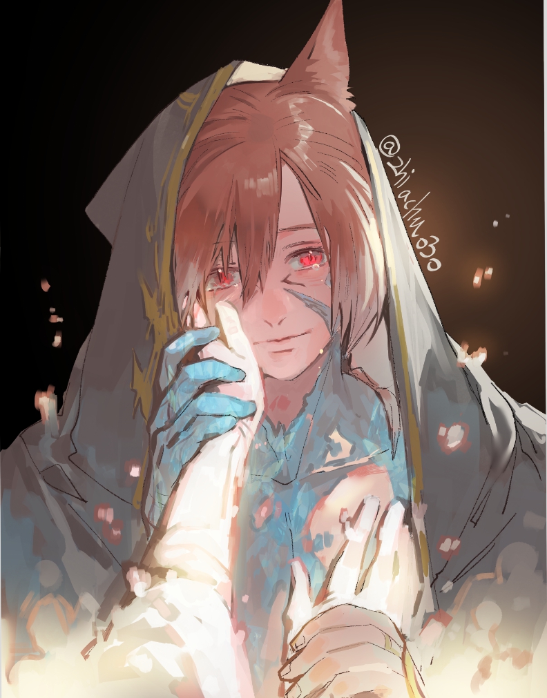 1boy animal_ears black_robe braid braided_ponytail brown_background cat_ears collarbone crystal crystal_exarch crystallization facial_mark final_fantasy final_fantasy_xiv g'raha_tia hair_between_eyes hand_on_another's_chest hand_on_another's_face hand_on_another's_hand hood hood_up jushenger looking_at_viewer low_ponytail male_focus material_growth miqo'te ponytail portrait pov pov_hands red_eyes red_hair robe short_hair single_braid slit_pupils smile solo_focus swept_bangs tearing_up tears twitter_username