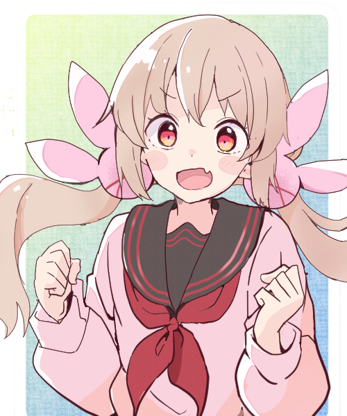 >_< 1girl :d black_sailor_collar blonde_hair blush clenched_hands commentary_request fang hair_ornament hands_up long_hair long_sleeves looking_at_viewer low_twintails natori_sana natori_sana_(school_uniform) neckerchief open_mouth pink_sweater rabbit_hair_ornament red_eyes red_neckerchief sailor_collar sana_channel skin_fang smile solo sweater twintails upper_body v-shaped_eyebrows virtual_youtuber youasato