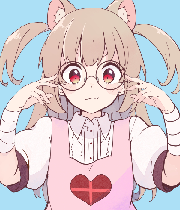 1girl adjusting_eyewear animal_ear_fluff animal_ears apron bandaged_arm bandaged_wrist bandages bespectacled blue_background blush cat_ears center_frills closed_mouth collared_dress commentary_request dress frills glasses hands_up heart heart_print light_brown_hair long_hair looking_at_viewer natori_sana natori_sana_(nurse) pink_apron puffy_short_sleeves puffy_sleeves red_eyes round_eyewear sana_channel short_sleeves simple_background smile solo two_side_up upper_body v-shaped_eyebrows virtual_youtuber white_dress youasato