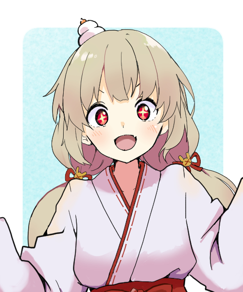 1girl :d alternate_costume blush commentary_request fang food hakama japanese_clothes kimono light_brown_hair long_hair long_sleeves looking_at_viewer low_twintails miko mochi natori_sana natori_sana_(miko) obi open_mouth red_eyes red_hakama red_sash sana_channel sash skin_fang smile solo sparkling_eyes twintails upper_body v-shaped_eyebrows virtual_youtuber white_kimono wide_sleeves youasato