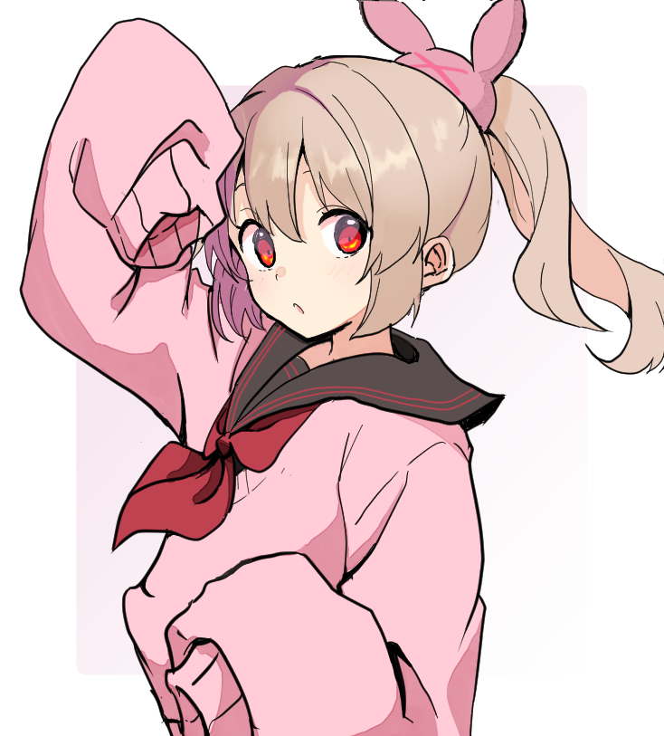>_< 1girl arm_up black_sailor_collar commentary_request hair_between_eyes hair_ornament light_brown_hair long_hair long_sleeves looking_at_viewer natori_sana natori_sana_(school_uniform) neckerchief official_alternate_costume pink_sweater ponytail rabbit_hair_ornament red_eyes red_neckerchief sailor_collar sana_channel sleeves_past_fingers sleeves_past_wrists solo sweater upper_body virtual_youtuber white_background youasato