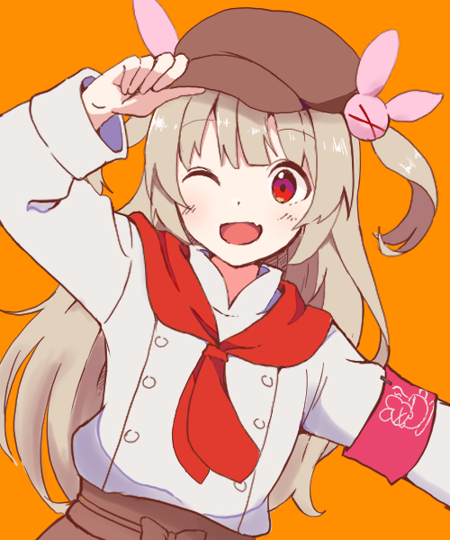 >_< 1girl ;d adjusting_clothes adjusting_headwear alternate_costume arm_up armband blonde_hair brown_hat newsboy_cap commentary_request fang hair_ornament hat jacket long_hair long_sleeves looking_at_viewer natori_sana one_eye_closed open_mouth orange_background rabbit_hair_ornament red_armband red_eyes red_scarf sana_channel scarf simple_background smile solo two_side_up upper_body virtual_youtuber white_jacket youasato