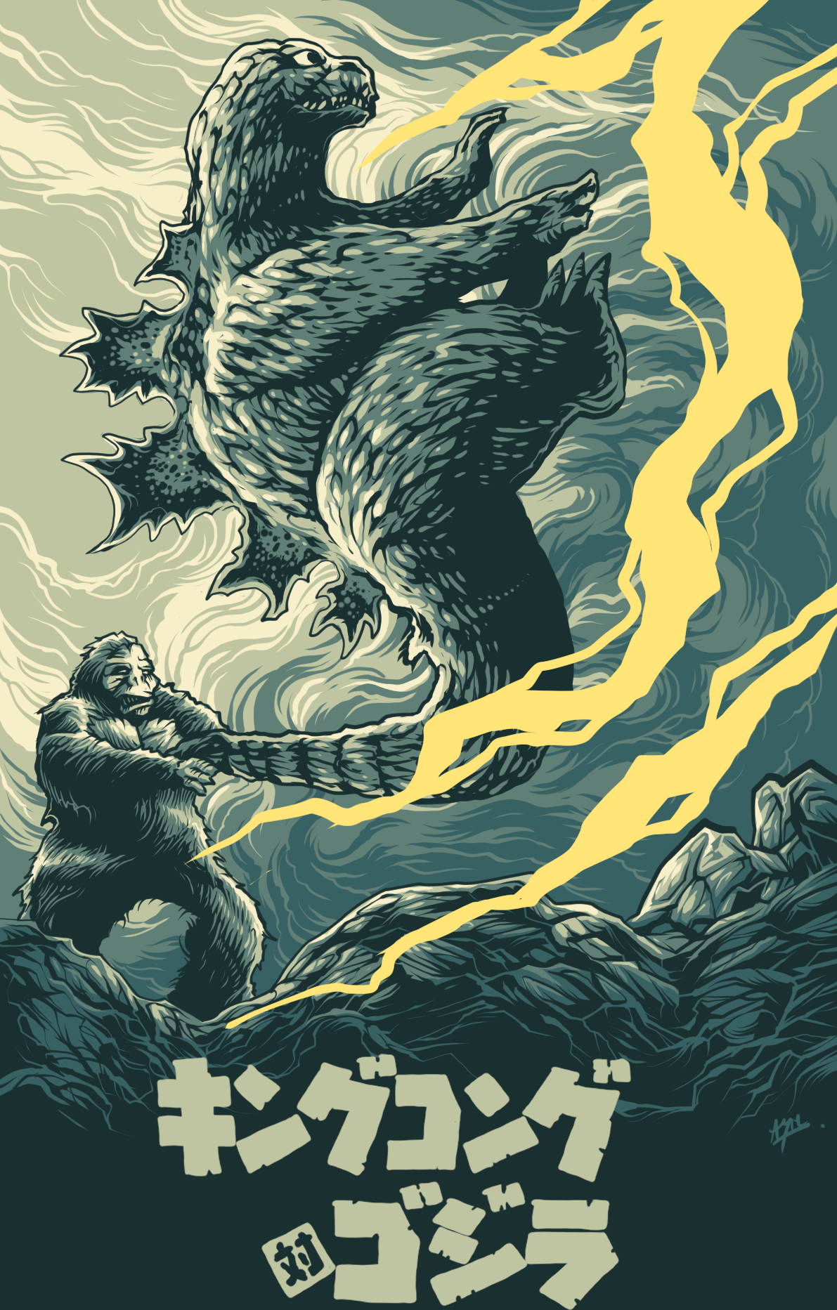 ape ayumu_(0413mini) crossover dinosaur electricity energy giant giant_monster godzilla godzilla_(series) gorilla grabbing_another's_tail highres japanese_text kaiju king_kong king_kong_(series) king_kong_vs._godzilla lightning monster sea_monster spikes tail tail_grab toho
