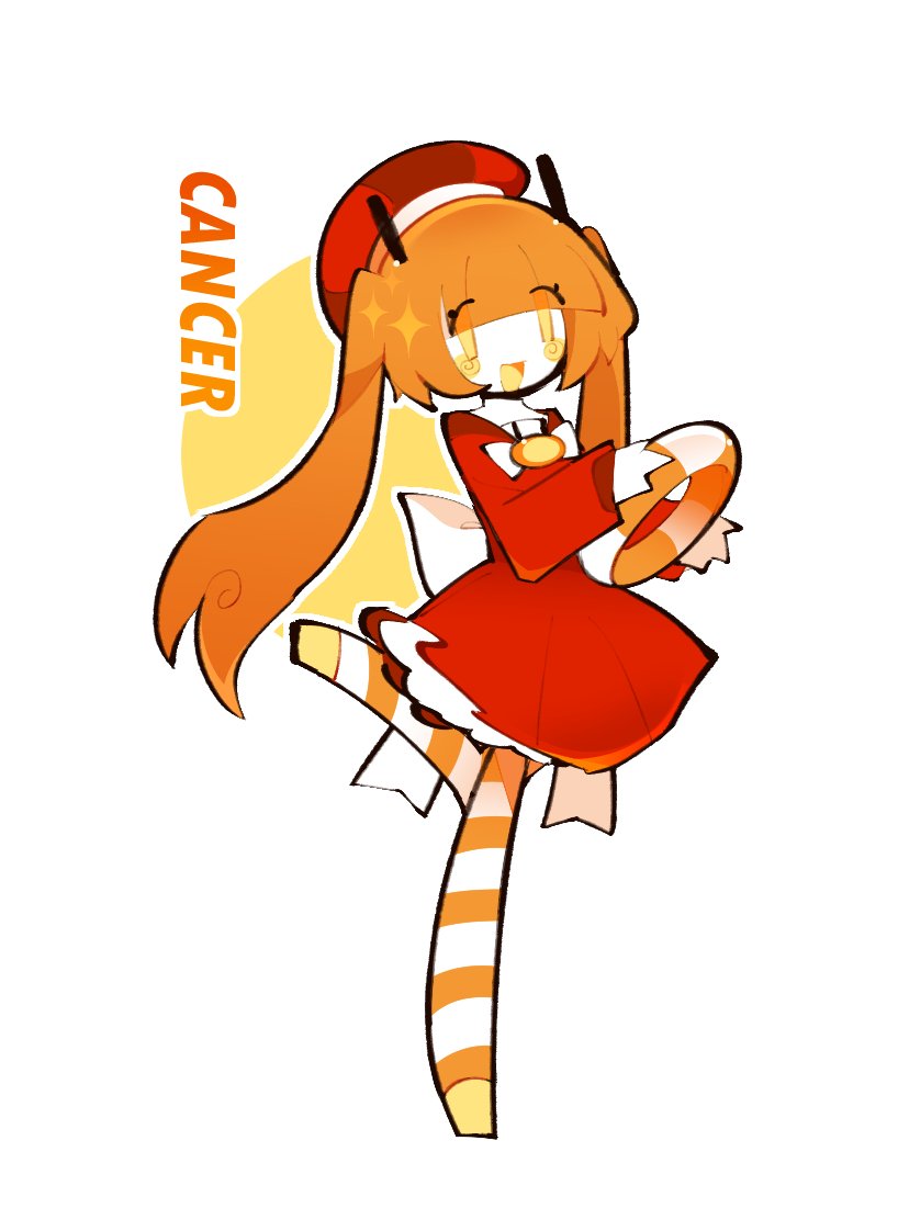 1girl bow cheek_swirl dress dress_bow eyes_visible_through_hair female_focus full_body hair_ornament happy hat jewelry looking_at_viewer open_mouth orange_hair original pantyhose ponytail red_dress red_hat ring scratchitone smile solo solo_focus striped_clothes striped_pantyhose yellow_eyes zodiac
