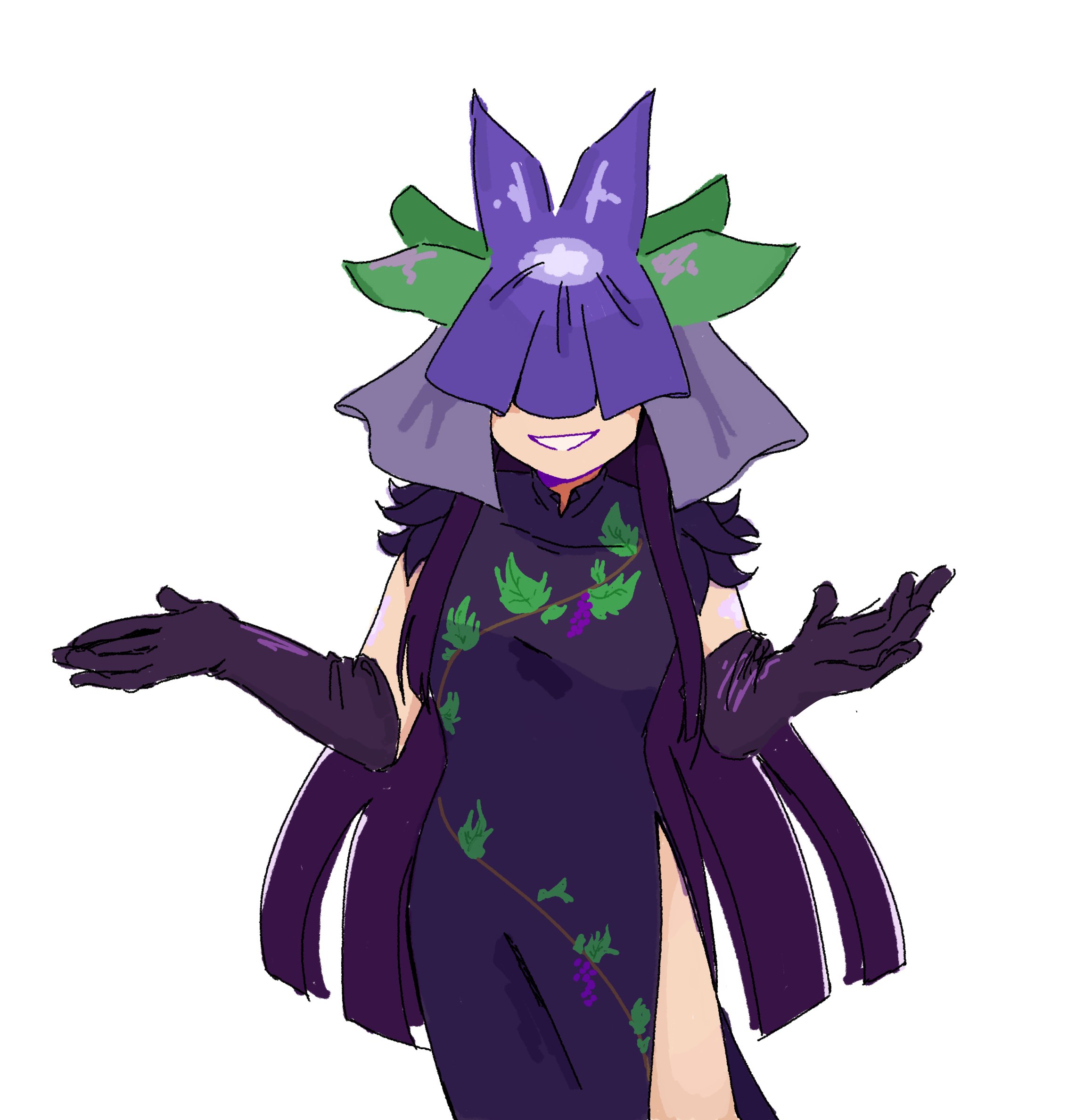 1girl black_gloves black_hair china_dress chinese_clothes cyanidegray dress elbow_gloves flower flower_on_head food_print fruit_print gloves grape_print highres long_hair looking_at_viewer open_mouth purple_dress purple_flower short_sleeves smile solo touhou unfinished_dream_of_all_living_ghost vine_print white_background yomotsu_hisami