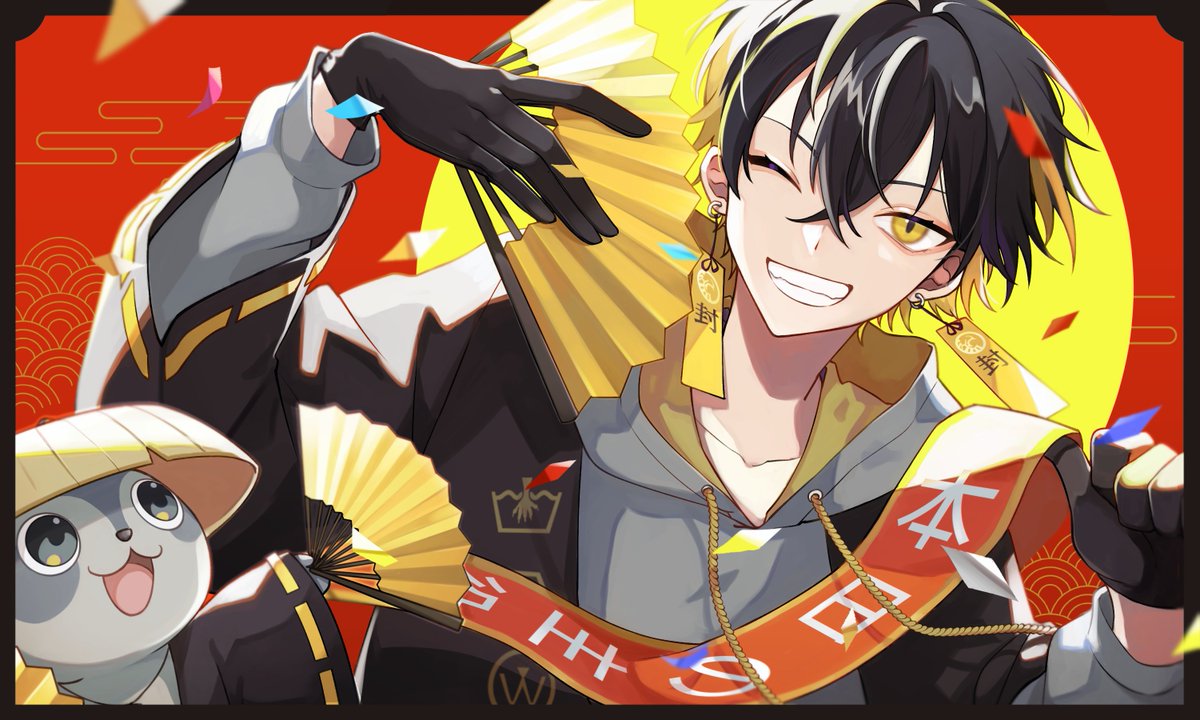 1boy animal birthday_sash black_border black_gloves black_hair black_jacket blonde_hair border clothed_animal commentary_request confetti crossed_bangs drawstring earrings echo_(k_521212) egasumi folding_fan gloves grey_hoodie grin hair_between_eyes hand_fan hands_up holding holding_fan holostars hood hood_down hoodie jacket jewelry kotatsu_(yatogami_fuma) letterboxed looking_at_viewer male_focus multicolored_hair one_eye_closed outside_border raccoon red_background ribbon-trimmed_sleeves ribbon_trim sandogasa sash seigaiha short_hair shoulder_sash smile solo thumbs_up two-tone_background two-tone_hair upper_body virtual_youtuber yatogami_fuma yellow_background yellow_eyes