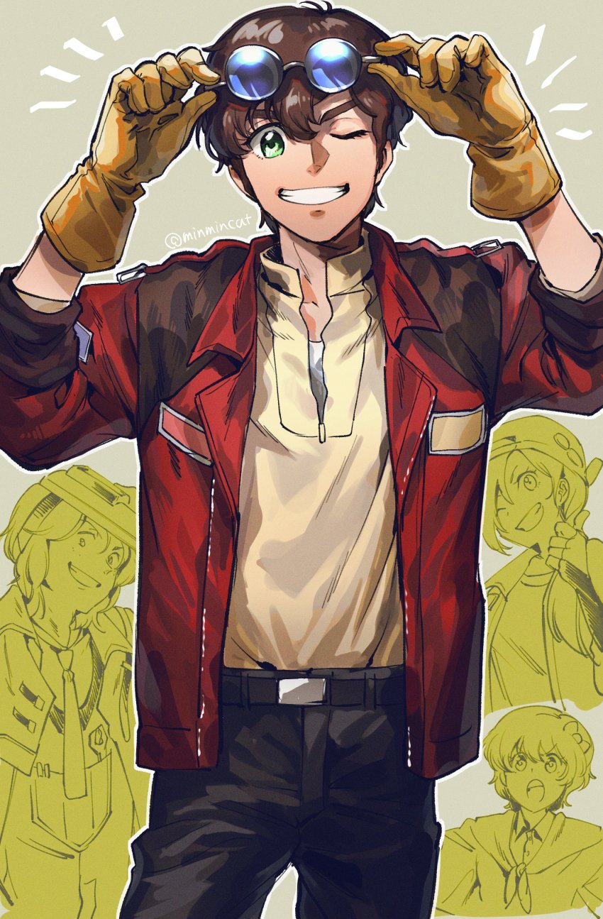 2boys 2girls beecha_oleg brother_and_sister brown_hair chanmura elle_vianno gloves goggles green_eyes grin gundam gundam_zz highres judau_ashta leina_ashta male_focus mask multiple_boys multiple_girls siblings smile welding_mask