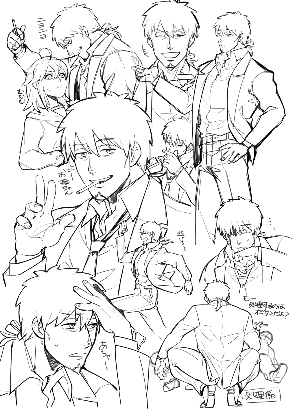 1boy 1girl ahoge bags_under_eyes belt blood blood_on_face bruise bruise_on_face closed_mouth collared_shirt facial_hair fate/grand_order fate_(series) fingernails formal_clothes frown fujimaru_ritsuka_(female) goatee grin hair_between_eyes hair_ribbon hand_on_own_hip hector_(fate) highres injury innfiniti male_focus mouth_hold necktie ponytail ribbon running shirt smile smoking squatting suit sweatdrop teeth_hold translation_request variations wiping_blood wiping_face