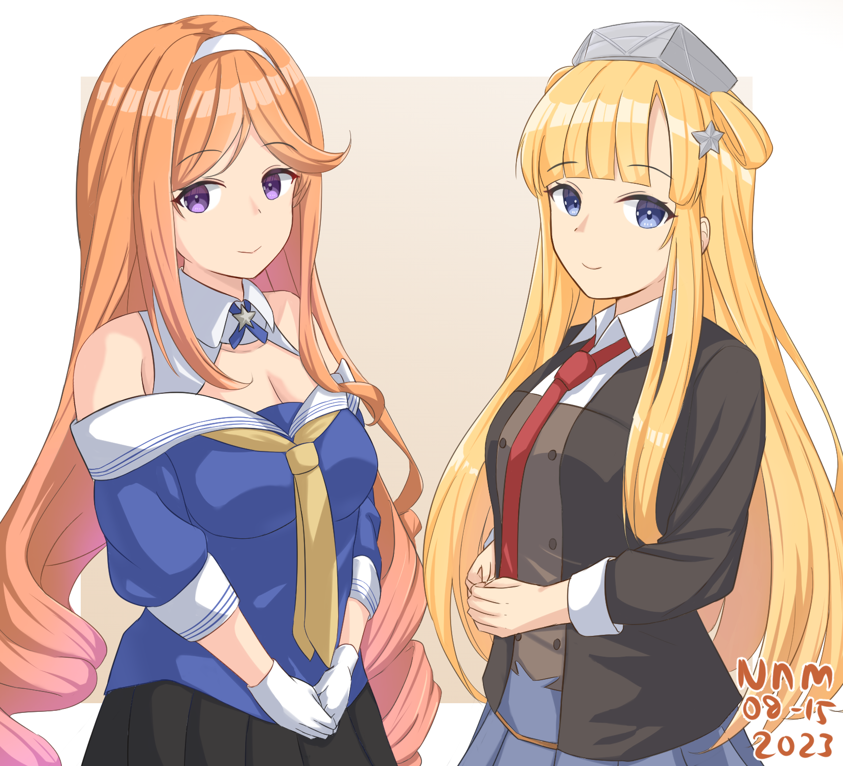 2girls artist_name asymmetrical_sidelocks black_skirt blonde_hair blue_shirt breasts brown_hair collared_shirt cosplay costume_switch dated double_bun drill_hair fletcher_(kancolle) fletcher_(kancolle)_(cosplay) fletcher_mk_ii_(kancolle) gloves gradient_hair grey_hairband grey_skirt hair_bun hair_ornament hairband highres jacket kantai_collection large_breasts long_hair long_sleeves multicolored_hair multiple_girls neckerchief necktie nnm off_shoulder pleated_skirt purple_eyes red_necktie sailor_collar school_uniform shirt side_drill sidelocks skirt solo star_(symbol) star_hair_ornament white_gloves white_hairband white_sailor_collar yellow_neckerchief yuugure_(kancolle) yuugure_(kancolle)_(cosplay)