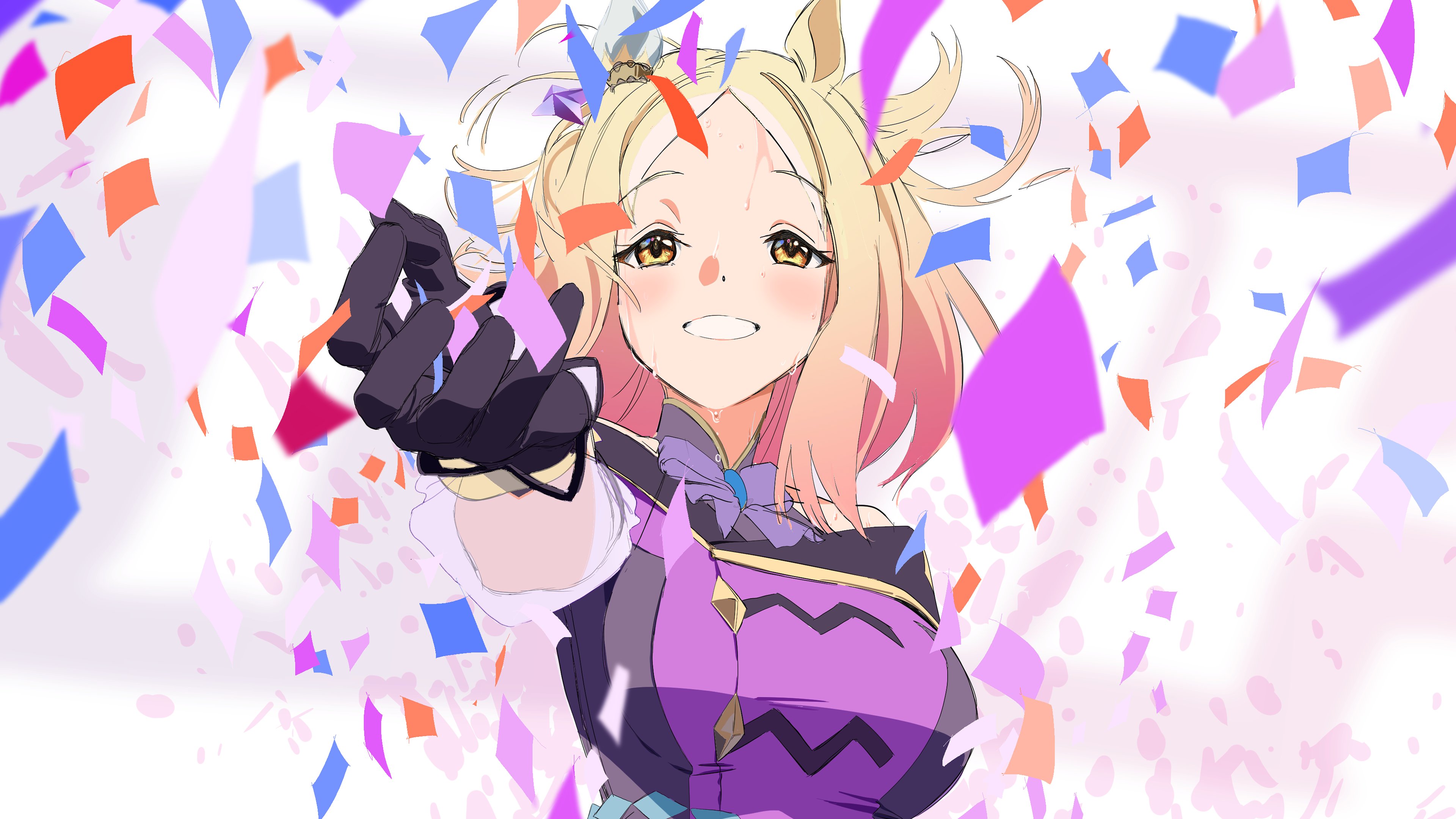 1girl absurdres animal_ears black_gloves blonde_hair breasts commentary_request confetti dress gloves highres horse_ears horse_girl large_breasts looking_at_viewer narita_top_road_(umamusume) off-shoulder_dress off_shoulder purple_dress short_hair solo umamusume umamusume:_road_to_the_top upper_body yamamoto_ken
