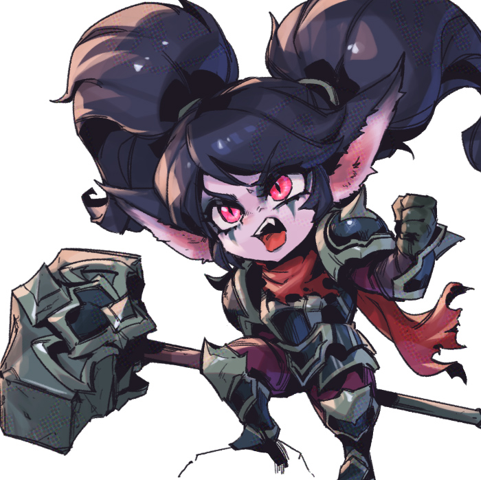 1girl armor black_armor black_hair brown_gloves clenched_hand fangs gloves hammer holding holding_hammer holding_weapon league_of_legends noxus_poppy official_alternate_costume phantom_cross pink_eyes poppy_(league_of_legends) red_scarf scarf simple_background solo teeth torn_clothes torn_scarf twintails upper_teeth_only weapon white_background yordle