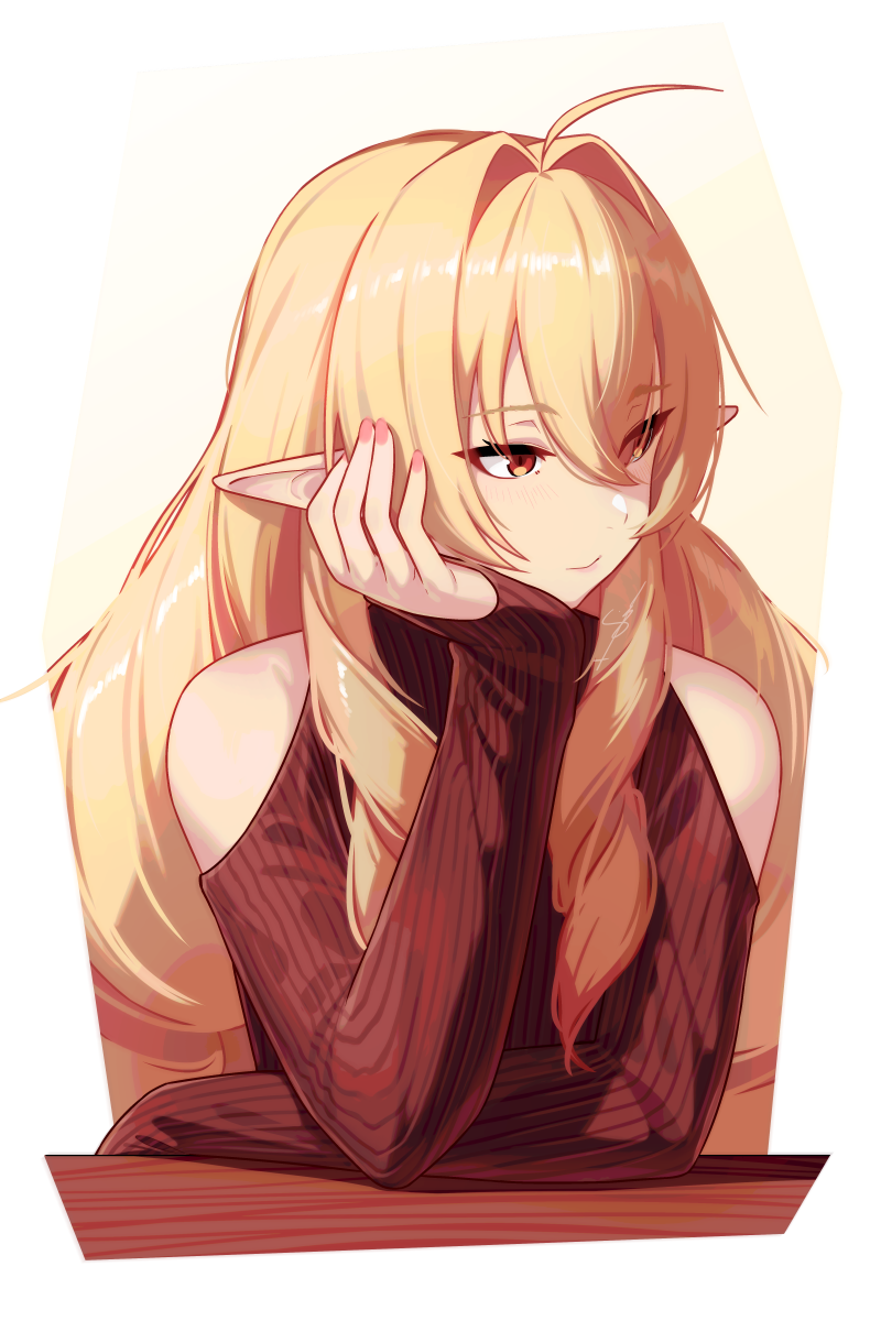 1girl ahoge blonde_hair closed_mouth clothing_cutout dev_(dev0614) drill_hair elf elinalise_dragonroad hair_between_eyes hair_intakes hand_on_own_cheek hand_on_own_face highres long_hair long_sleeves looking_to_the_side mushoku_tensei pointy_ears red_eyes red_sweater shoulder_cutout sleeves_past_wrists solo sweater upper_body
