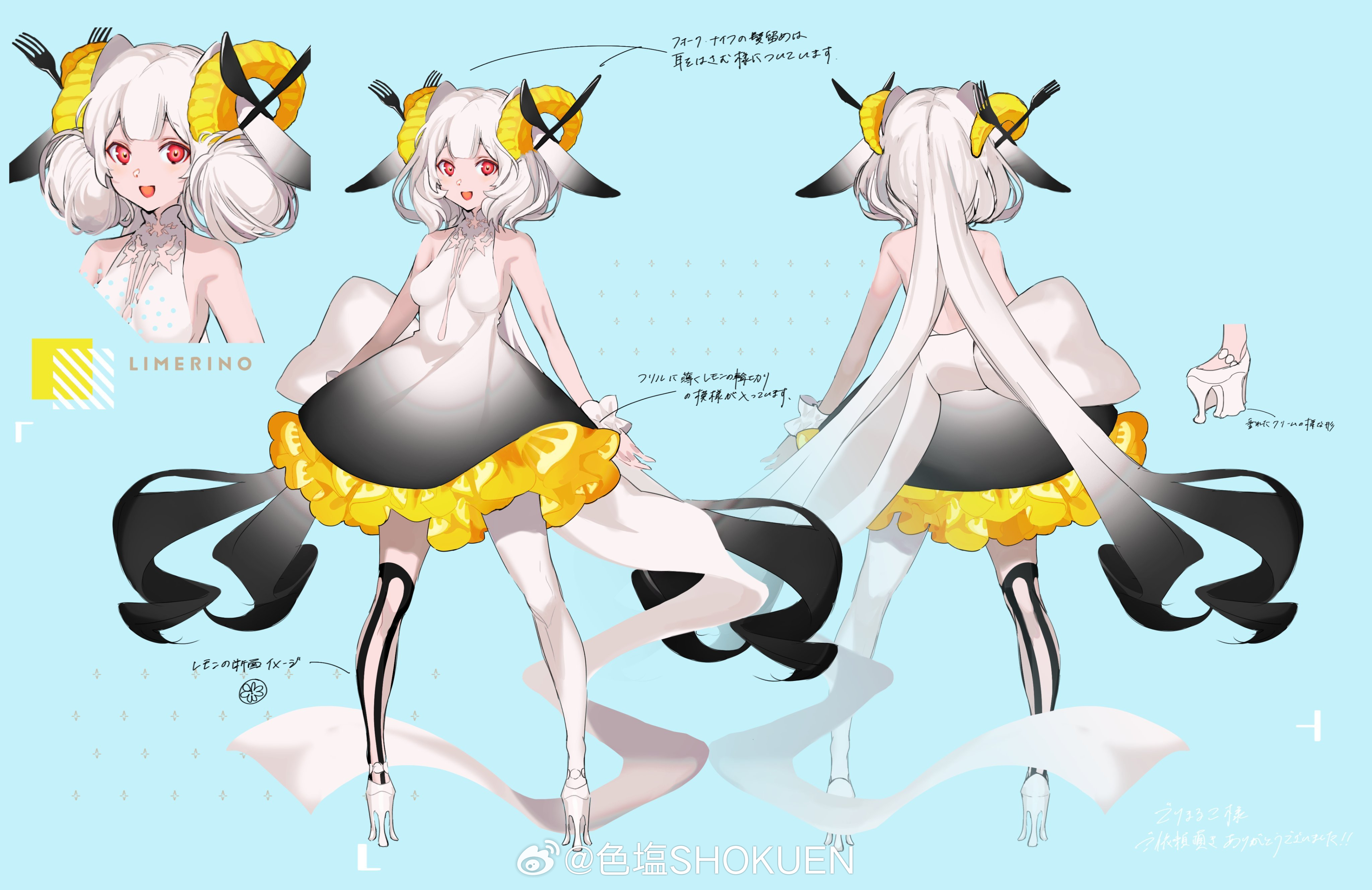 :d absurdres animal_ears aqua_background back_bow backless_dress backless_outfit bare_shoulders black_dress black_hair black_thighhighs bow breasts reference_sheet double_bun dress fork_hair_ornament frilled_dress frills gradient_clothes gradient_dress gradient_hair hair_bun high_heels highres horns impossible_clothes impossible_dress knife_hair_ornament legs_apart long_hair low_twintails medium_breasts multicolored_hair multiple_views open_mouth original pantyhose red_eyes sheep_ears sheep_horns shokuen_(oxstl) short_dress single_leg_pantyhose single_thighhigh sleeveless sleeveless_dress smile standing striped_clothes striped_thighhighs thighhighs turnaround twintails vertical-striped_clothes vertical-striped_thighhighs very_long_hair watermark weibo_watermark white_bow white_dress white_footwear white_hair white_pantyhose wrist_cuffs yellow_horns