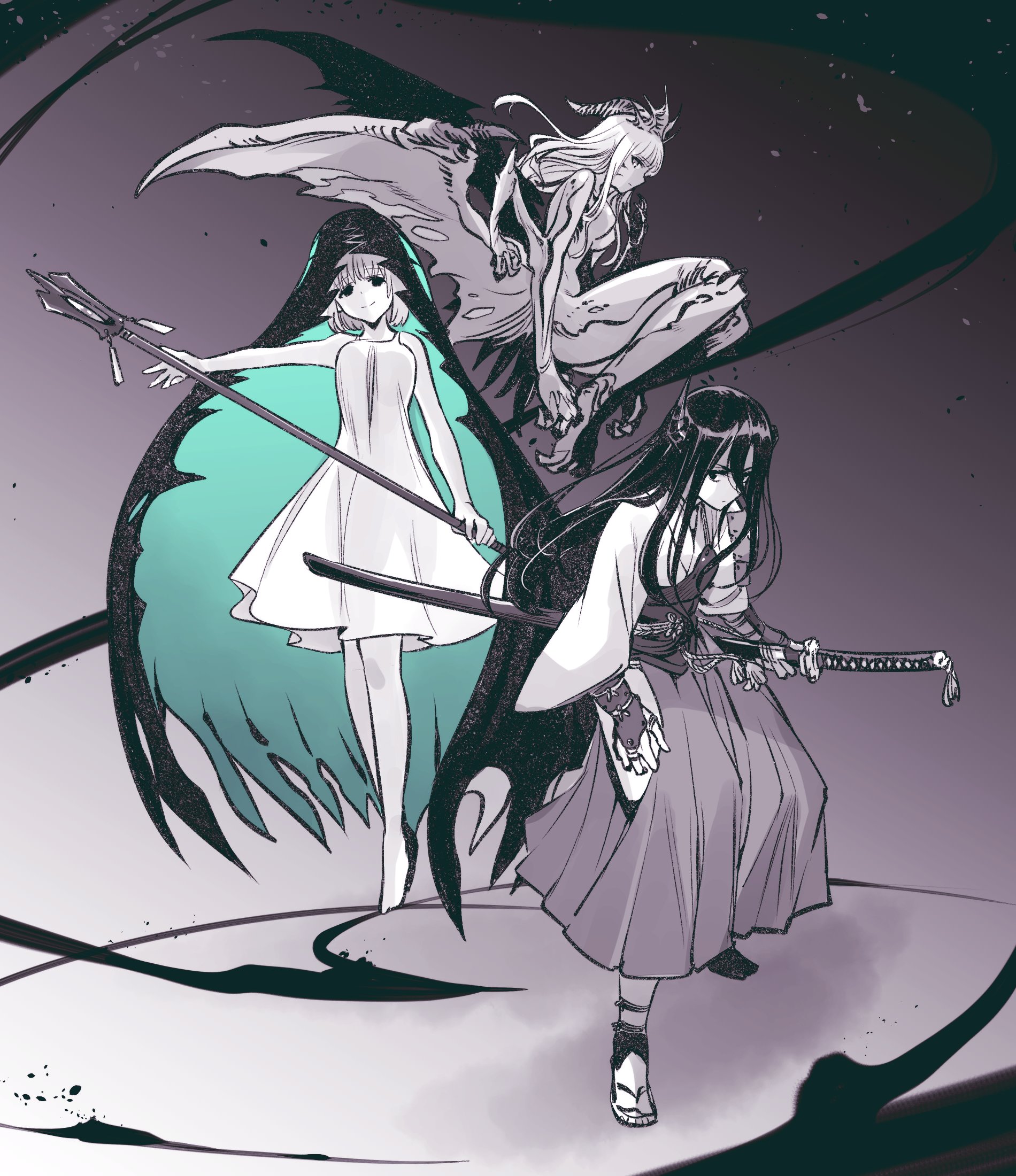 3girls armor breastplate character_request commentary dougi dress english_commentary hakama hakama_skirt highres holding holding_weapon japanese_clothes katana kato_takuji long_hair ma_no_mono-tachi multiple_girls no_shoes polearm priestess_(ishiyumi) samurai sandals short_hair skirt spear staff sword weapon white_dress wings