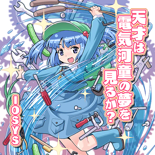 1girl album_cover blue_boots blue_eyes blue_hair blue_jacket blue_skirt blunt_bangs boots newsboy_cap collar collared_jacket cover cucumber eyelashes game_cg gears green_hat hair_bobbles hair_ornament hat holding iosys jacket jun2onod kawashiro_nitori key leg_up long_sleeves medium_hair medium_skirt object_request official_art open_mouth pocket puffy_long_sleeves puffy_sleeves rubber_boots screw screwdriver skirt skirt_set smile sparkle teeth tools touhou touhou_cannonball two_side_up upper_teeth_only water white_background white_collar wrench