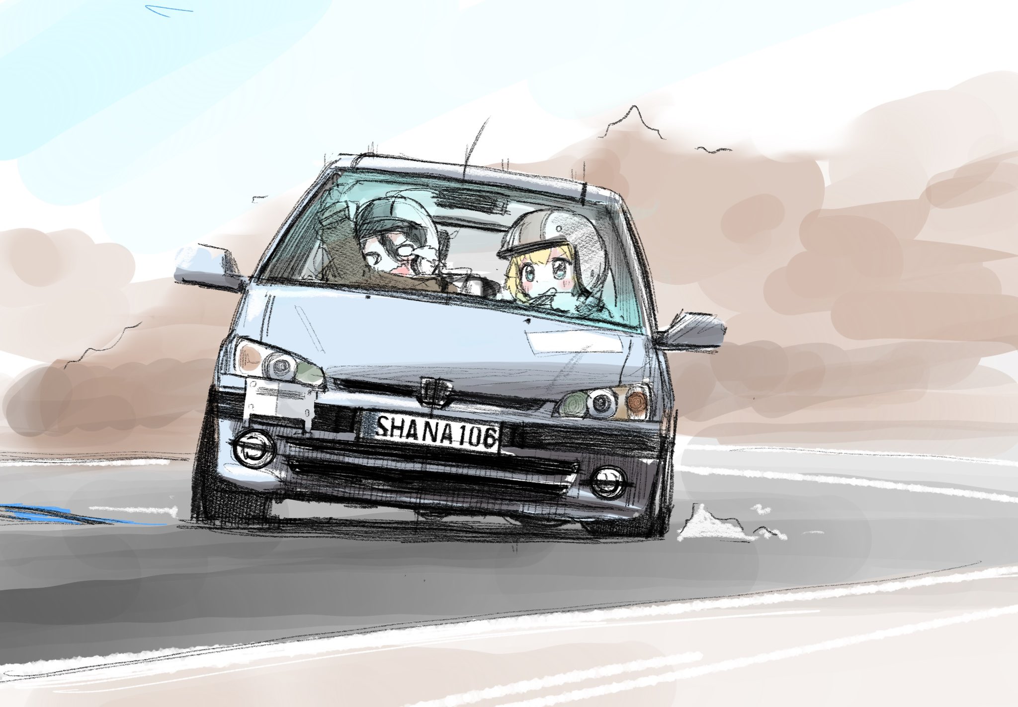 2girls black_hair black_jacket blonde_hair blue_eyes blush driving dust helmet highres hikageno jacket multiple_girls open_mouth original parted_lips peugeot peugeot_106 racetrack scared shadow v-shaped_eyebrows vehicle_focus white_eyes white_headwear