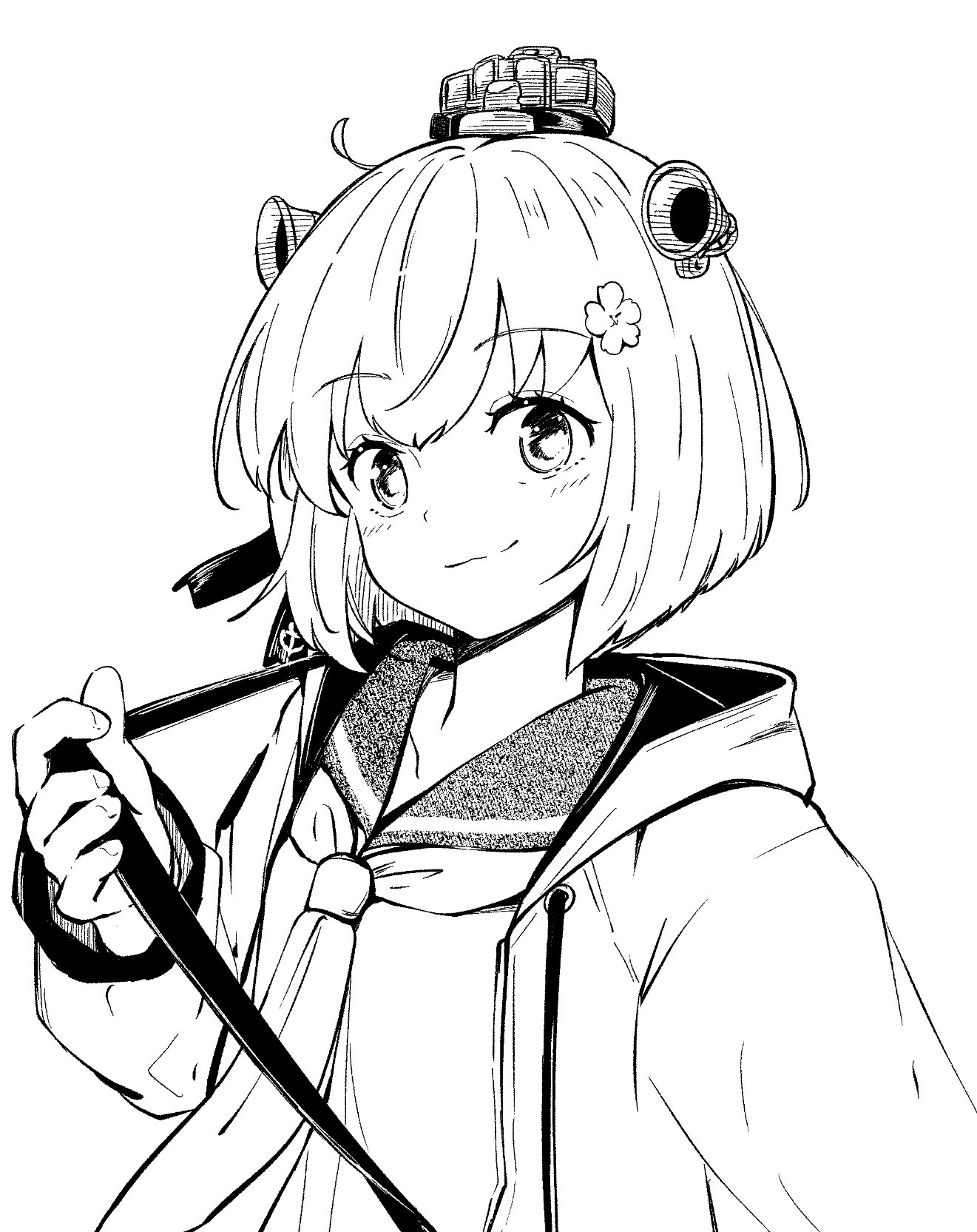 1girl drawstring dress flower greyscale hair_flower hair_ornament headgear highres hood hooded_jacket jacket kantai_collection looking_at_viewer ludens_(inonaka_koubou) monochrome neckerchief sailor_dress short_hair smile solo stra upper_body yukikaze_(kancolle) yukikaze_kai_ni_(kancolle)