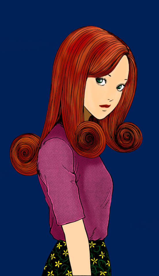 1girl curly_hair flower goshima_kirie green_eyes itou_junji parted_bangs red_hair red_lips shirt shirt_tucked_in short_sleeves solo spiral_hair uzumaki