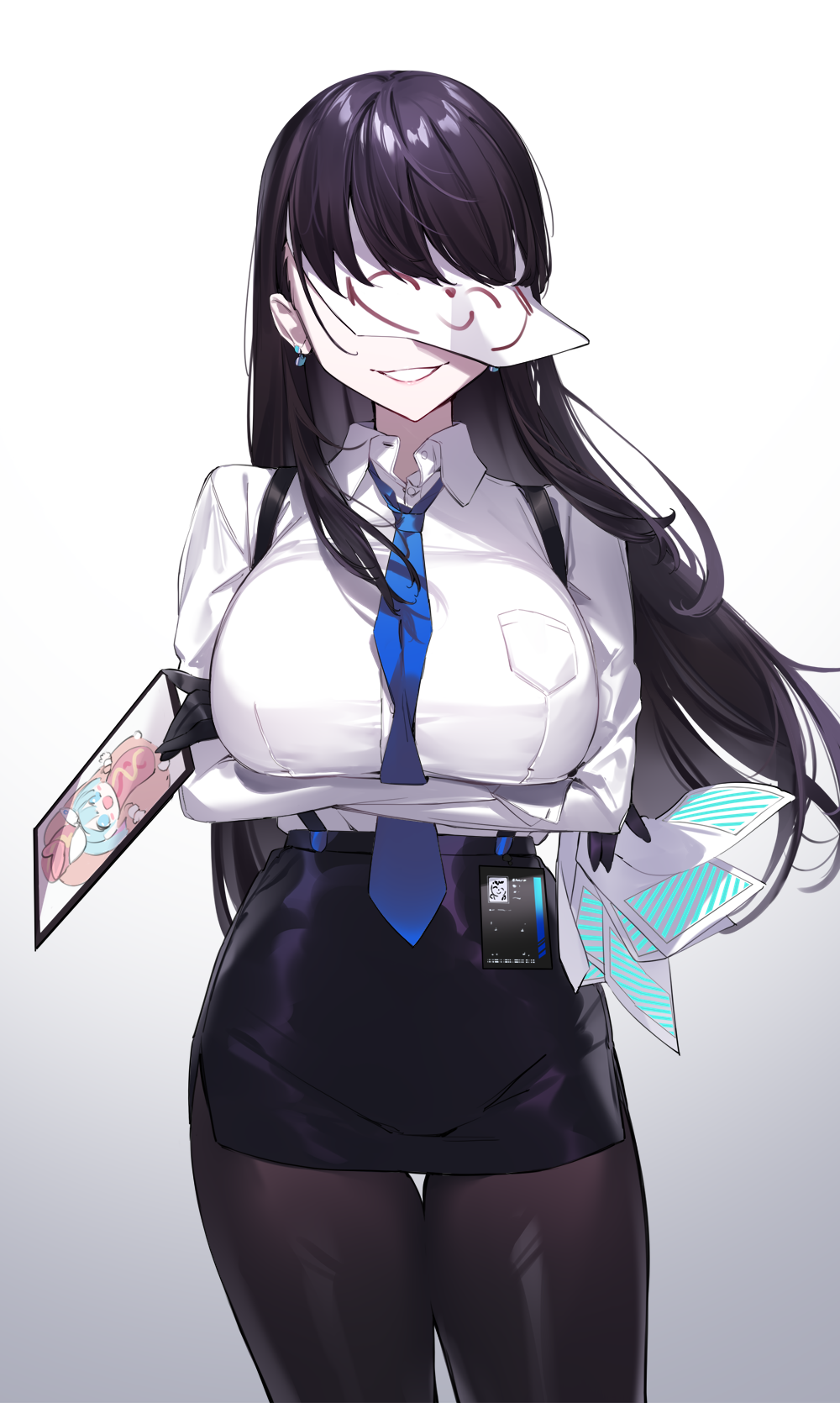 1girl arm_under_breasts black_gloves black_hair black_pantyhose black_skirt blue_archive blue_necktie breast_pocket breasts collared_shirt commentary cowboy_shot crossed_arms doodle_sensei_(blue_archive) dress_shirt earrings faceless faceless_female facing_viewer female_sensei_(blue_archive) gloves gradient_background high-waist_skirt highres holding holding_paper holding_tablet_pc id_card jewelry large_breasts long_hair long_sleeves miniskirt necktie pantyhose paper paper_on_head pencil_skirt pocket sensei_(blue_archive) shirt shirt_tucked_in simple_background skirt smile solo suspender_skirt suspenders tablet_pc tented_shirt white_background white_shirt yaguo