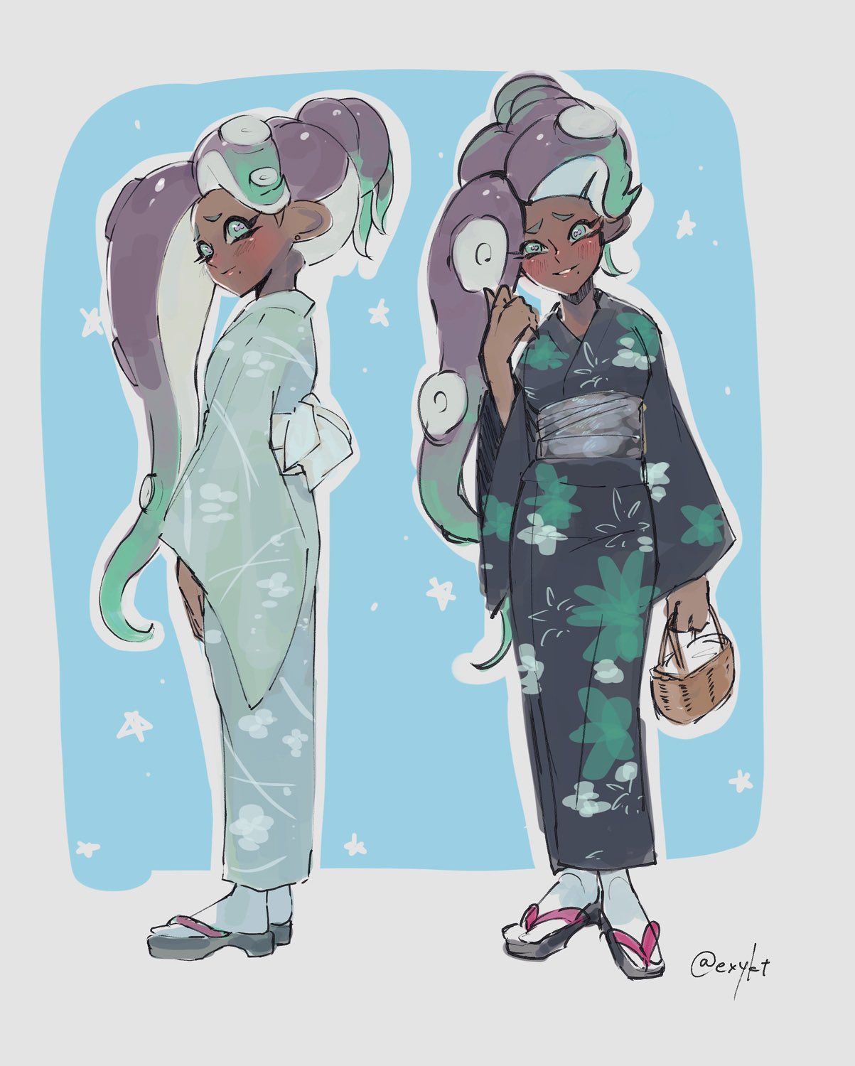 1girl aqua_hair basket black_footwear black_hair black_kimono blue_background blue_eyes blue_kimono blush breasts dark-skinned_female dark_skin earrings green_eyes grin highres holding japanese_clothes jewelry kimono large_breasts long_sleeves looking_at_viewer marina_(splatoon) mole mole_under_mouth multicolored_hair multiple_views nintendo obi octoling octopus_girl print_kimono sandals sash sizu smile socks splatoon_(series) star_(symbol) star_symbol_background suction_cups teeth tentacle_hair tentacles two-tone_hair white_socks wide_sleeves