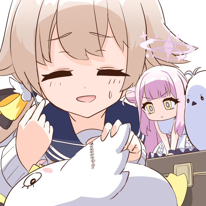 2girls :d ^_^ bird blue_archive blunt_bangs bow brown_hair closed_eyes commentary_request dress frilled_dress frills hair_between_eyes hair_bow hair_bun hair_ornament hair_ribbon hair_scrunchie halo hifumi_(blue_archive) holding holding_sewing_needle long_hair long_sleeves looking_at_another mika_(blue_archive) mini_person minigirl multiple_girls needle open_mouth peroro_(blue_archive) pink_hair ribbon school_uniform scrunchie serafuku sewing sewing_needle shooka sidelocks simple_background single_side_bun sitting size_difference sleeveless sleeveless_dress smile suitcase sweatdrop twintails v-shaped_eyebrows v_arms white_background white_dress wing_hair_ornament yellow_eyes