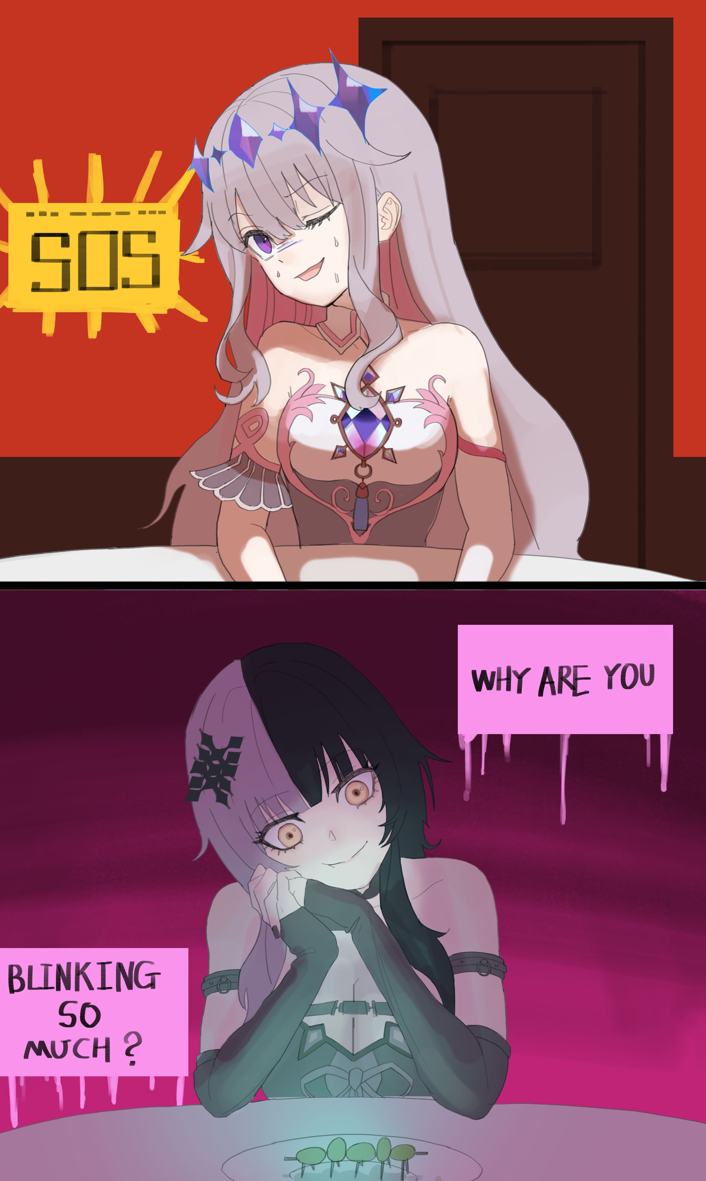 absurdres black_hair blinking breasts chest_jewel cleavage colored_inner_hair crown crystal detached_collar door dress elbow_gloves english_text failose gloves hair_ornament highres hololive hololive_english koseki_bijou koseki_bijou_(1st_costume) long_hair looking_at_viewer medium_breasts multicolored_hair multiple_girls open_mouth pink_hair purple_eyes shiori_novella shiori_novella_(1st_costume) small_breasts smile split-color_hair sweat two-tone_hair virtual_youtuber yellow_eyes