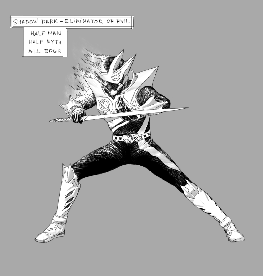 1boy armor boots bracer breastplate commentary english_commentary english_text full_body grey_background helmet knee_boots male_focus monochrome original shadow_dark_(y_naf) solo superhero_costume tokusatsu y_naf