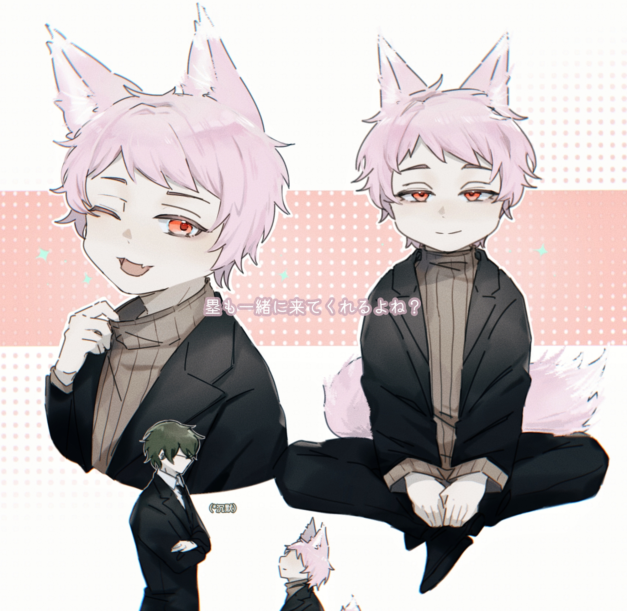 2boys animal_ears atou_haruki black_jacket black_necktie black_pants brown_sweater chinese_commentary closed_mouth collared_shirt commentary_request crossed_legs fang film_grain fox_boy fox_ears fox_tail green_hair highres jacket kemonomimi_mode long_sleeves male_focus multiple_boys multiple_views necktie one_eye_closed open_clothes open_jacket open_mouth otowa_rui_(saibou_shinkyoku) pants pink_hair red_eyes ribbed_sweater saibou_shinkyoku shirt short_hair sitting skin_fang smile spoilers sweater tail translation_request turtleneck turtleneck_sweater white_shirt zhizhangertongbaitang