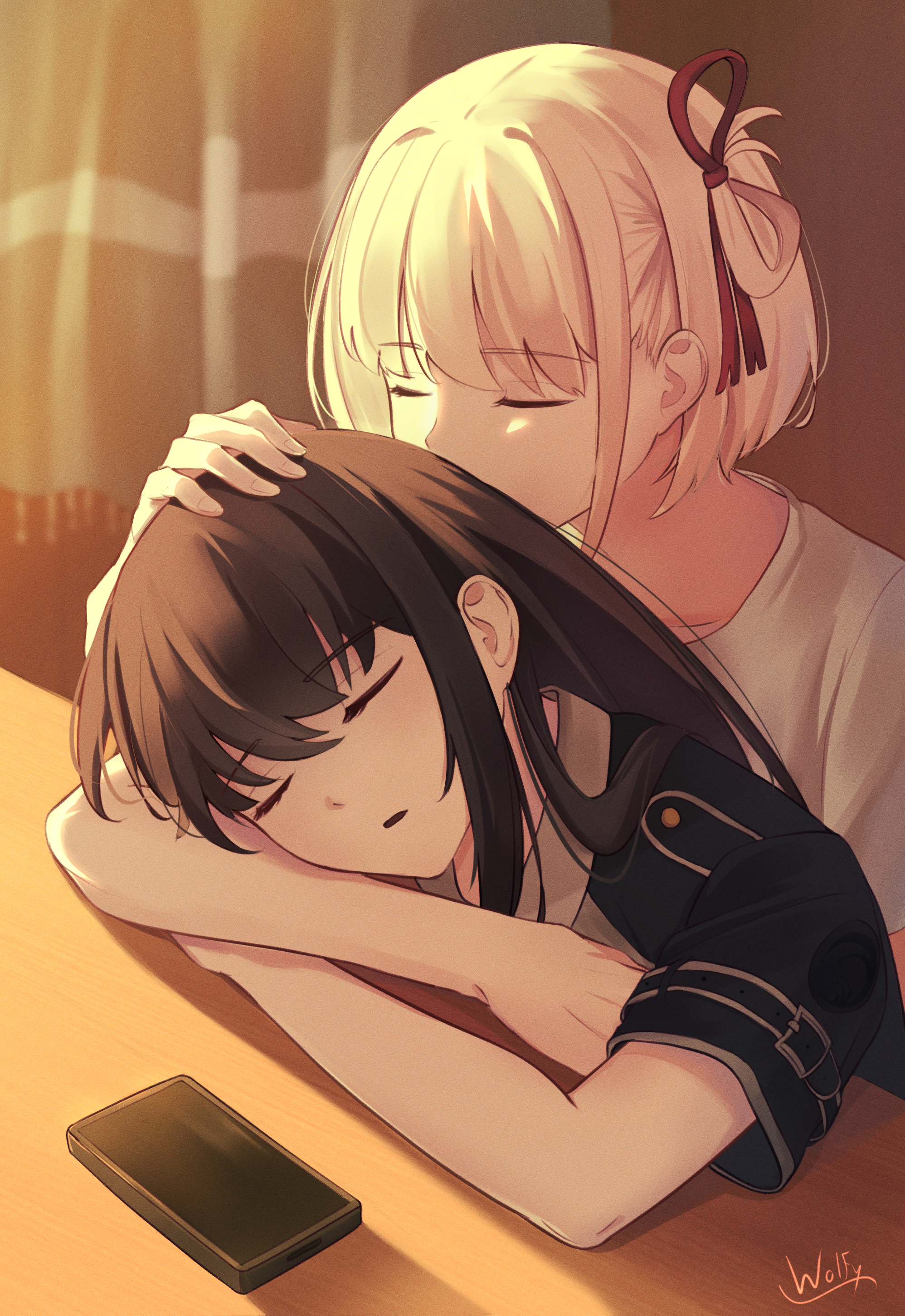 2girls absurdres arm_rest artist_name black_hair blonde_hair cellphone chxoswolf closed_eyes commentary crossed_arms curtains english_commentary hair_ribbon hand_on_another's_head kissing_head highres indoors inoue_takina long_hair lycoris_recoil lycoris_uniform multiple_girls nishikigi_chisato parted_lips phone red_ribbon ribbon shirt short_hair short_sleeves sidelocks signature sleeping smartphone sunset table white_shirt yuri