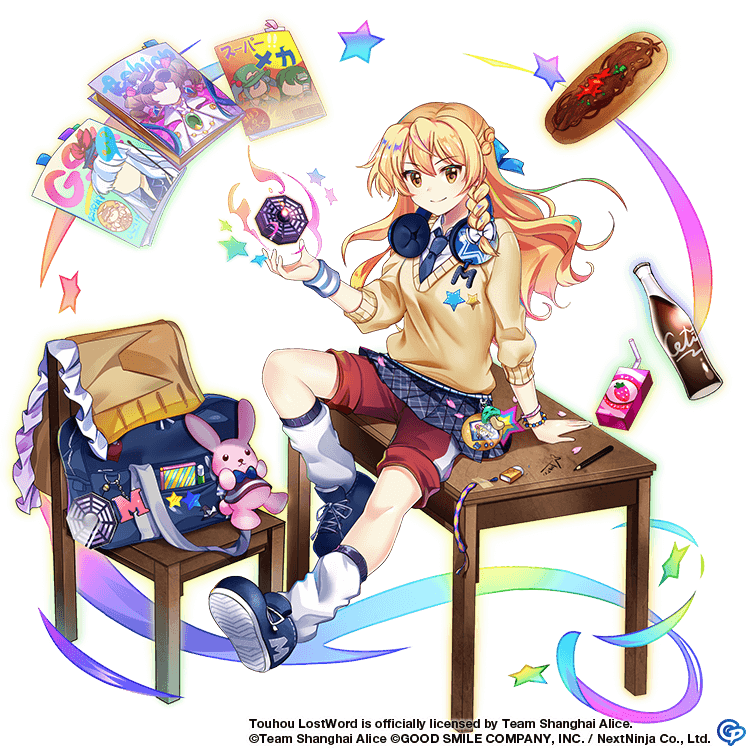 1girl alternate_costume bag black_footwear black_necktie black_skirt book bow bracelet braid chair closed_mouth collared_shirt commentary copyright_name copyright_notice english_commentary eraser food fruit_juice full_body game_cg glass_bottle hair_bow headphones jewelry kamishirasawa_keine kawashiro_nitori kirisame_marisa kirisame_marisa_(dauntless_problem_child) kochiya_sanae long_hair long_sleeves looking_at_viewer mini-hakkero miniskirt mushroom mystia_lorelei necktie pen plaid_clothes plaid_skirt red_shorts rotte_(1109) school_uniform shirt shorts side_braid simple_background single_braid sitting skirt smile soda solo star_(symbol) stuffed_animal stuffed_rabbit stuffed_toy sweater table third-party_source touhou touhou_lostword white_background white_bow white_shirt wristband yakisoba yellow_eyes yellow_sweater yorigami_jo'on