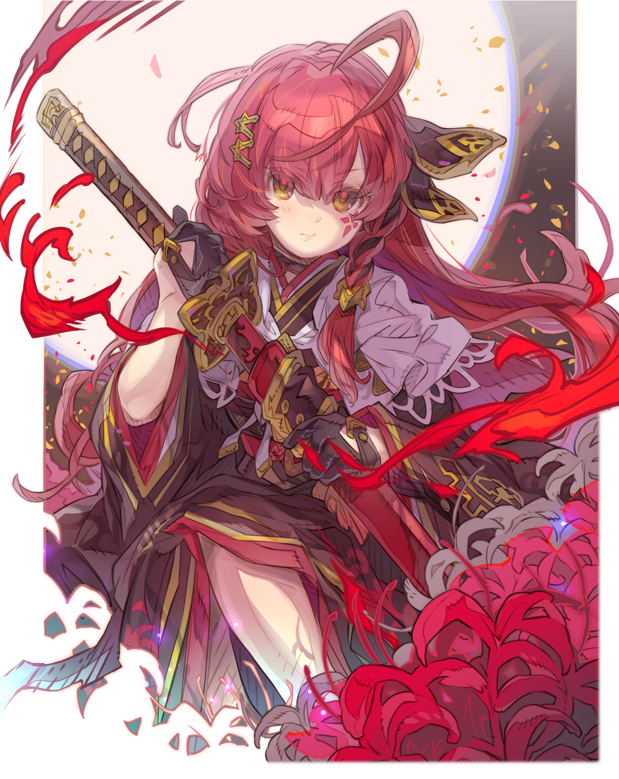 1girl black_gloves black_kimono brown_eyes closed_mouth commentary_request commission flower gloves hair_between_eyes hair_ornament haku_(sabosoda) half_gloves highres holding holding_sheath holding_sword holding_weapon japanese_clothes katana kimono long_hair long_sleeves looking_at_viewer original petals red_flower red_hair sheath skeb_commission solo spider_lily sword unsheathing very_long_hair weapon wide_sleeves