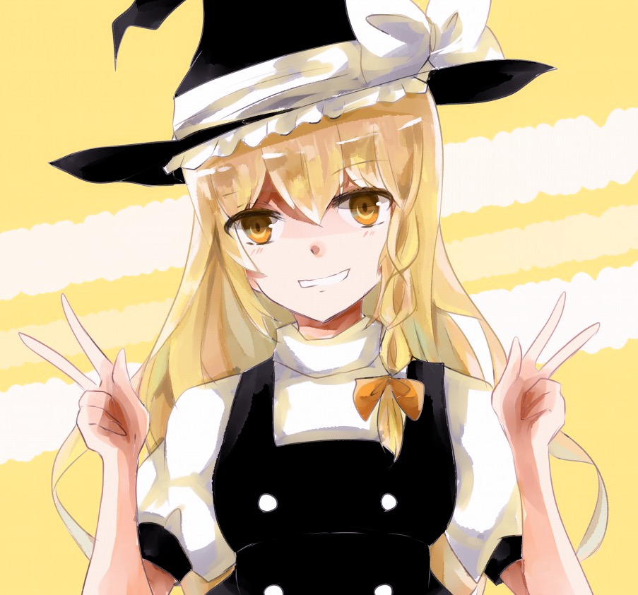 1girl aridamikannn black_hat black_vest blonde_hair bow braid breasts diagonal_stripes double_v hair_between_eyes hat hat_bow hat_ribbon head_tilt kirisame_marisa long_hair looking_at_viewer medium_breasts open_mouth puffy_short_sleeves puffy_sleeves ribbon shirt short_sleeves simple_background single_braid solo striped_background teeth touhou turtleneck upper_body v vest white_bow white_ribbon white_shirt witch_hat yellow_background yellow_eyes