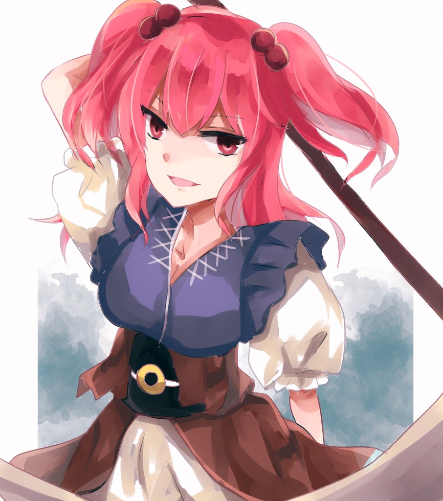 1girl aridamikannn arm_up collarbone cowboy_shot frilled_sleeves frills hair_bobbles hair_ornament head_tilt holding holding_scythe light_smile looking_at_viewer onozuka_komachi open_mouth pink_hair puffy_short_sleeves puffy_sleeves red_eyes scythe shirt short_sleeves simple_background touhou two_side_up v-shaped_eyebrows white_background white_shirt