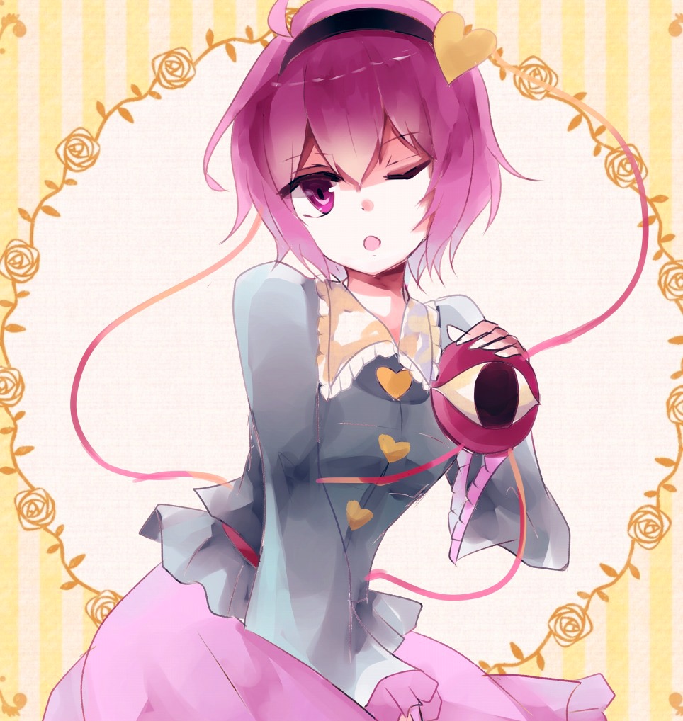 1girl ;o aridamikannn blouse blue_shirt cowboy_shot floral_background frilled_shirt_collar frilled_skirt frilled_sleeves frills hair_between_eyes hair_ornament heart heart_hair_ornament komeiji_satori long_sleeves looking_at_viewer one_eye_closed open_mouth pink_eyes pink_hair pink_skirt rose_background shirt short_hair simple_background skirt solo striped_background third_eye touhou vertical_stripes yellow_background