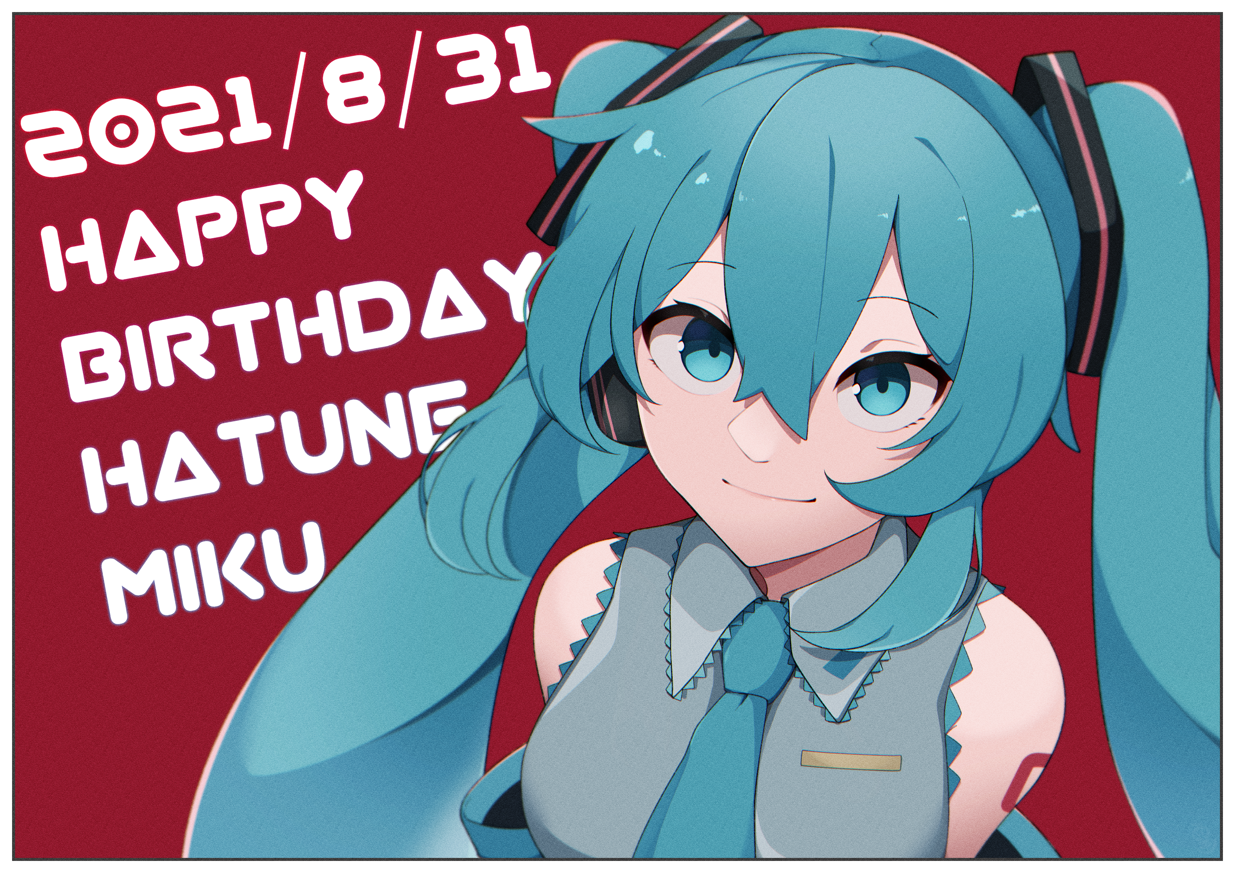 1girl absurdres blue_eyes blue_hair blue_necktie border breasts character_name closed_mouth collared_shirt commentary_request grey_shirt hair_between_eyes happy_birthday hatsune_miku highres long_bangs long_hair looking_at_viewer medium_breasts necktie red_background shirt simple_background sleeveless sleeveless_shirt smile solo twintails upper_body uziki_ntoki very_long_hair vocaloid white_border