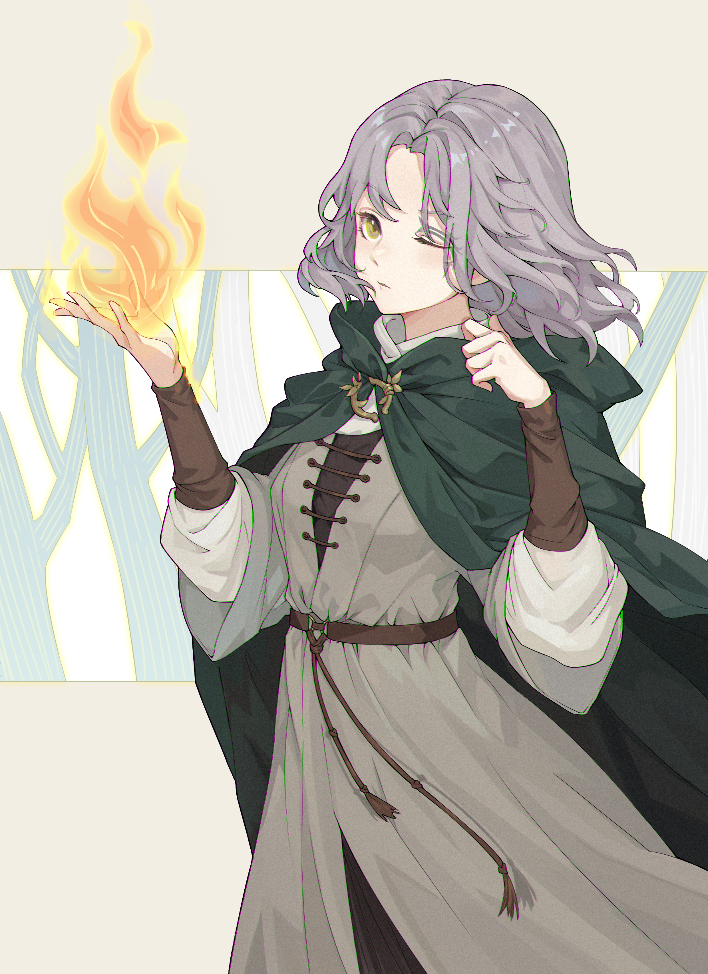 1girl absurdres belt brown_belt cape commentary dress elden_ring facial_tattoo fire flaming_hand green_cape grey_dress grey_hair highres hood hood_down hooded_cape kushige_musume long_sleeves magic melina_(elden_ring) one_eye_closed pyrokinesis short_hair solo tattoo wavy_hair yellow_eyes