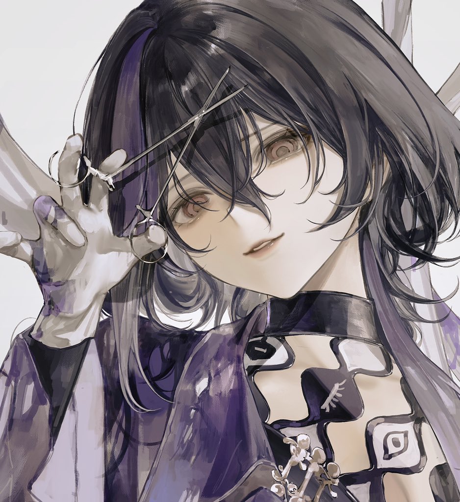 1girl black_hair close-up giraffe_three gloves grey_background grey_hair hair_between_eyes holding holding_scissors jacket long_hair looking_at_viewer multicolored_hair parted_lips path_to_nowhere portrait purple_jacket red_eyes scissors sidelocks simple_background smile streaked_hair two-tone_hair uni_(path_to_nowhere) white_gloves