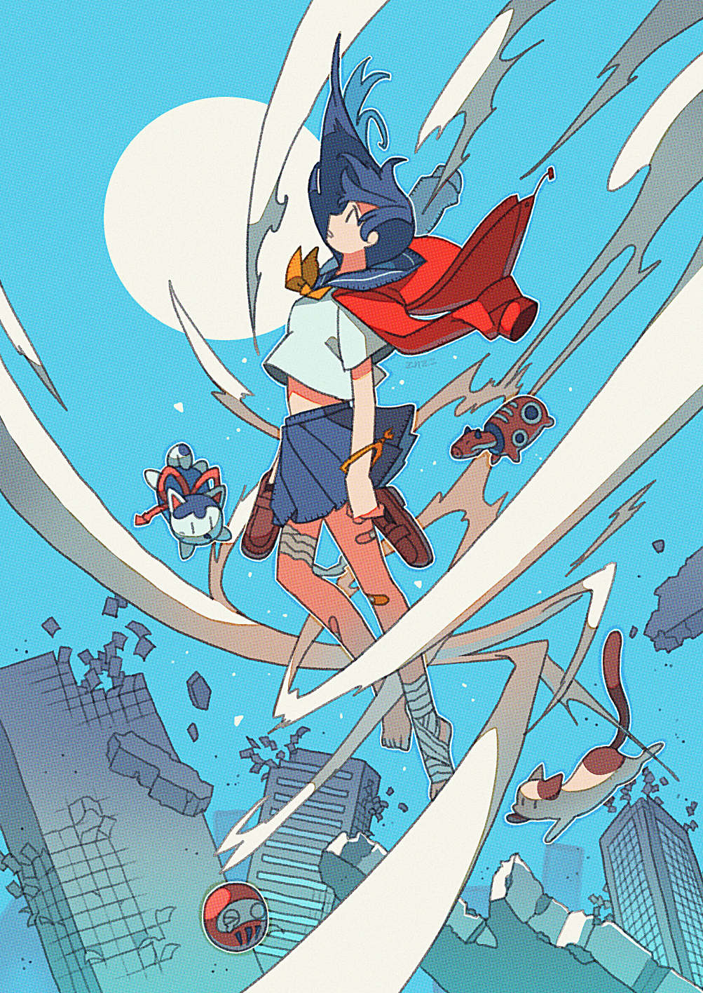 1girl akabeko animal bandages bandaid barefoot blue_hair blue_skirt building cape cat daruma_doll floating from_side full_body highres holding holding_footwear holding_shoes holding_unworn_clothes long_hair looking_up neckerchief original parted_lips pleated_skirt red_cape school_uniform serafuku shirt shoes skirt sky sun tenteko_mai51 unworn_shoes white_shirt yellow_neckerchief
