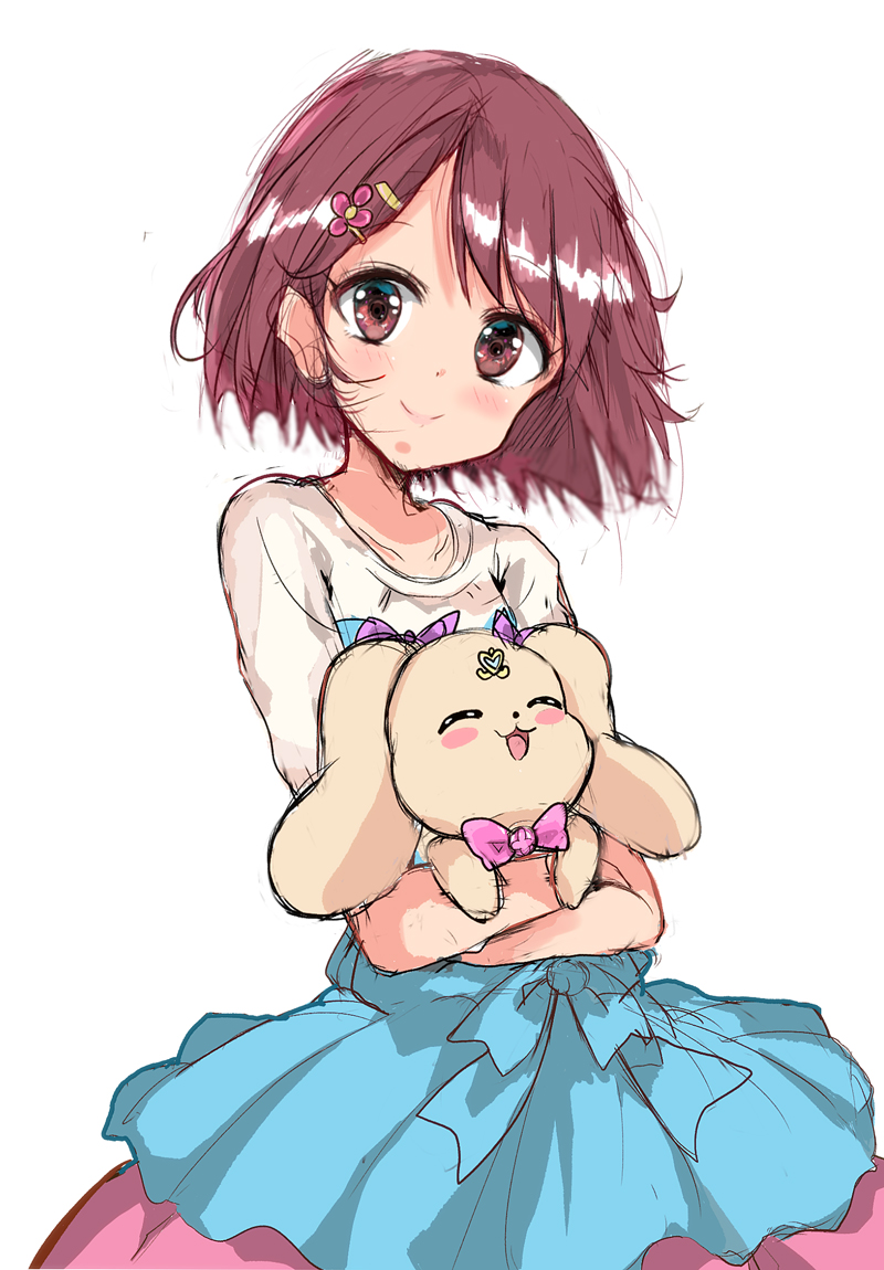 1girl blue_skirt blush bow brown_eyes brown_hair closed_mouth collarbone commentary_request flower hair_flower hair_ornament hairclip hanadera_nodoka haru_(nature_life) healin'_good_precure hug layered_skirt looking_at_viewer pink_flower pink_skirt precure purple_bow rabbit shirt short_sleeves simple_background sketch skirt smile swept_bangs white_background white_shirt