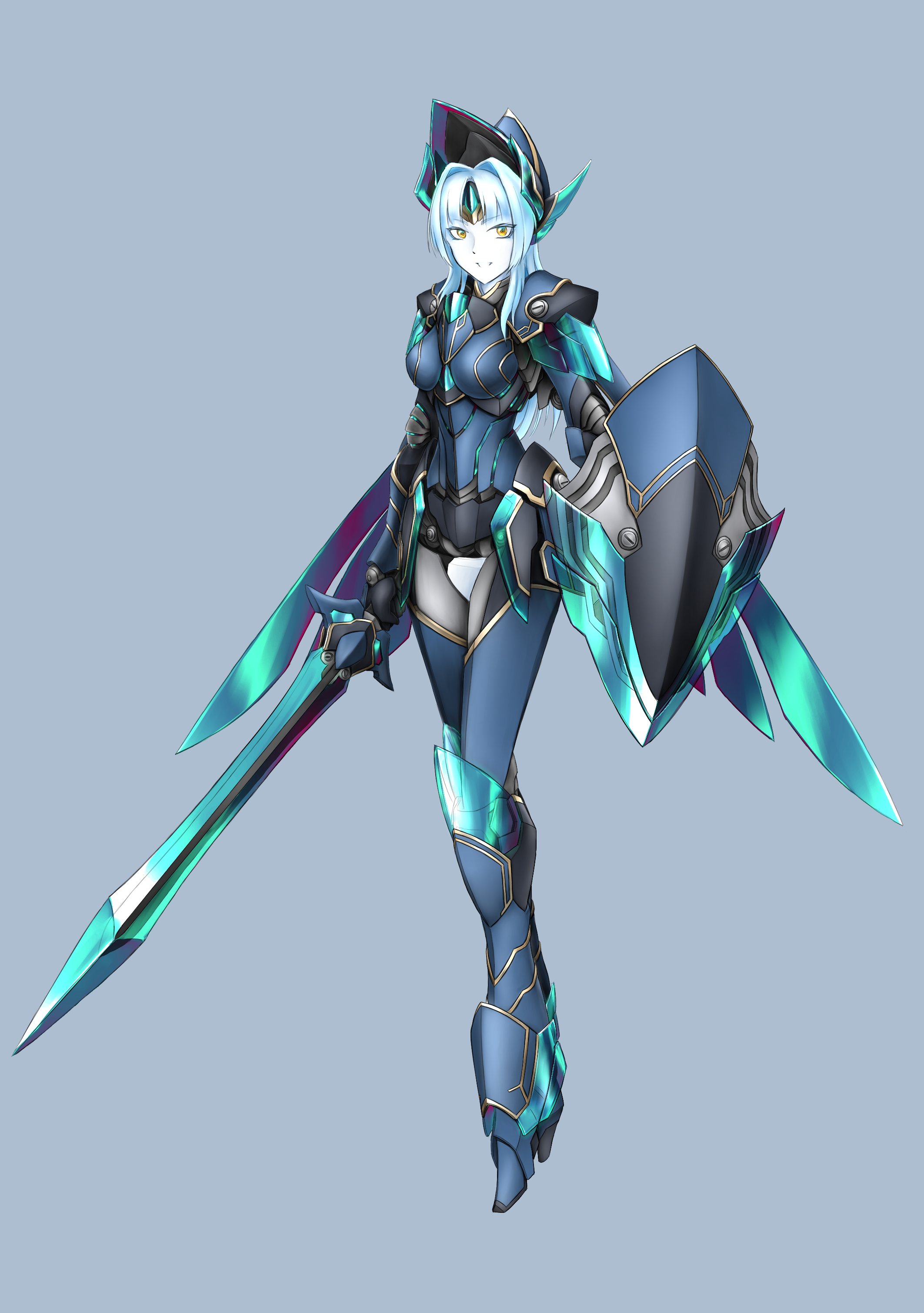 1girl absurdres armor blue_background blue_hair colored_skin fantasy full_body helmet high_heels highres holding holding_sword holding_weapon joints long_hair looking_at_viewer me_ganchyo original robot_girl robot_joints shield smile solo sword valkyrie weapon white_skin yellow_eyes