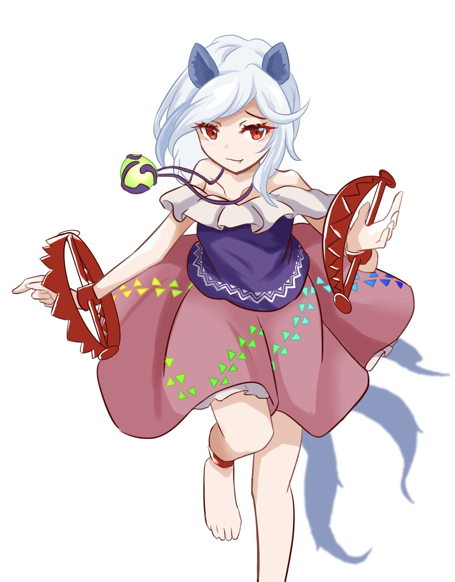 1girl animal_ears arm_up bare_shoulders barefoot blush collarbone dress fang bear_trap frilled_dress frills highres jewelry kaisouou_konbu leg_up looking_at_viewer mitsugashira_enoko necklace off-shoulder_shirt off_shoulder pink_skirt red_eyes shirt simple_background skirt sleeveless sleeveless_shirt standing standing_on_one_leg tail toes touhou unfinished_dream_of_all_living_ghost white_background white_hair wolf_ears wolf_girl wolf_tail