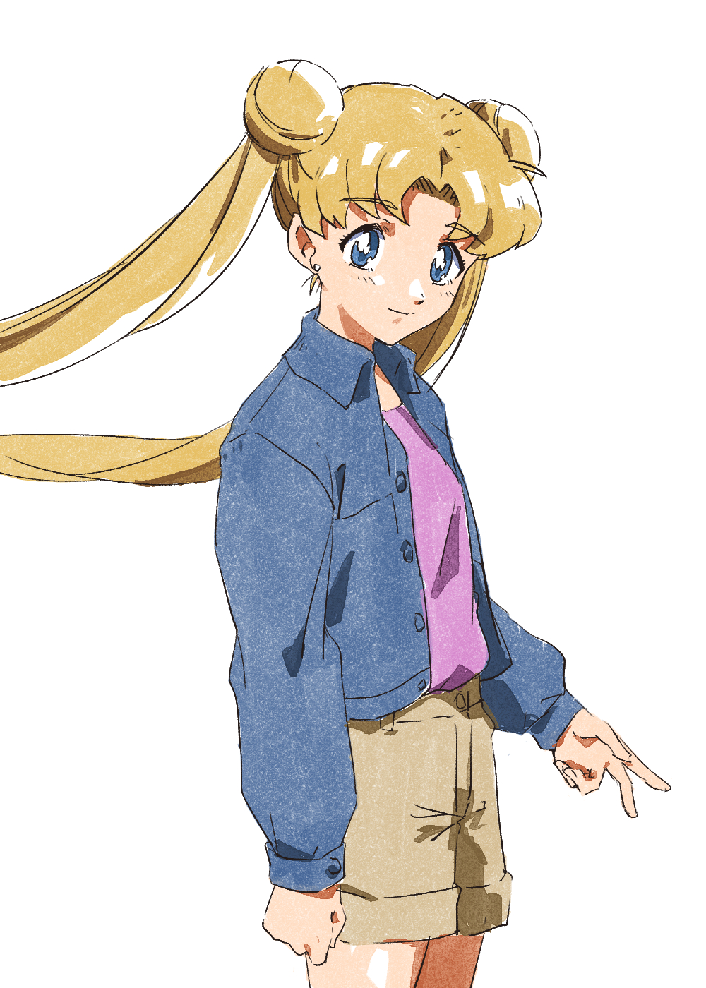 1girl ako_(hoshiya_830) bishoujo_senshi_sailor_moon blonde_hair blue_eyes double_bun earrings hair_bun happy highres jewelry shorts simple_background smile solo standing tsukino_usagi v white_background