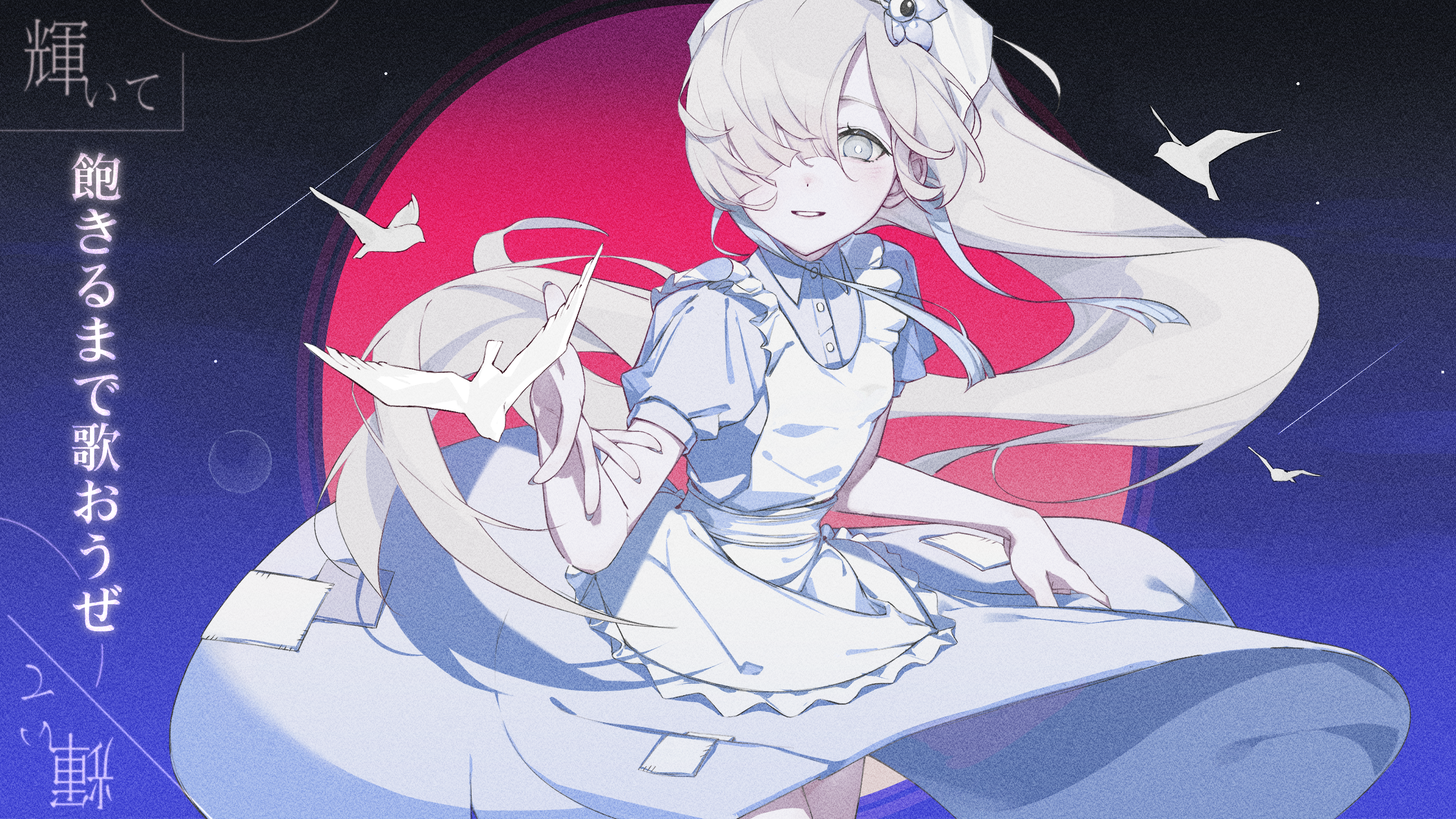 1girl apron bird cowboy_shot dress floating_hair flower full_body grey_eyes grey_hair hair_flower hair_ornament hair_over_one_eye headscarf highres isekaijoucho kamitsubaki_studio long_hair momori0118 moon night parted_lips ponytail red_moon short_sleeves sky smile solo very_long_hair virtual_youtuber white_apron