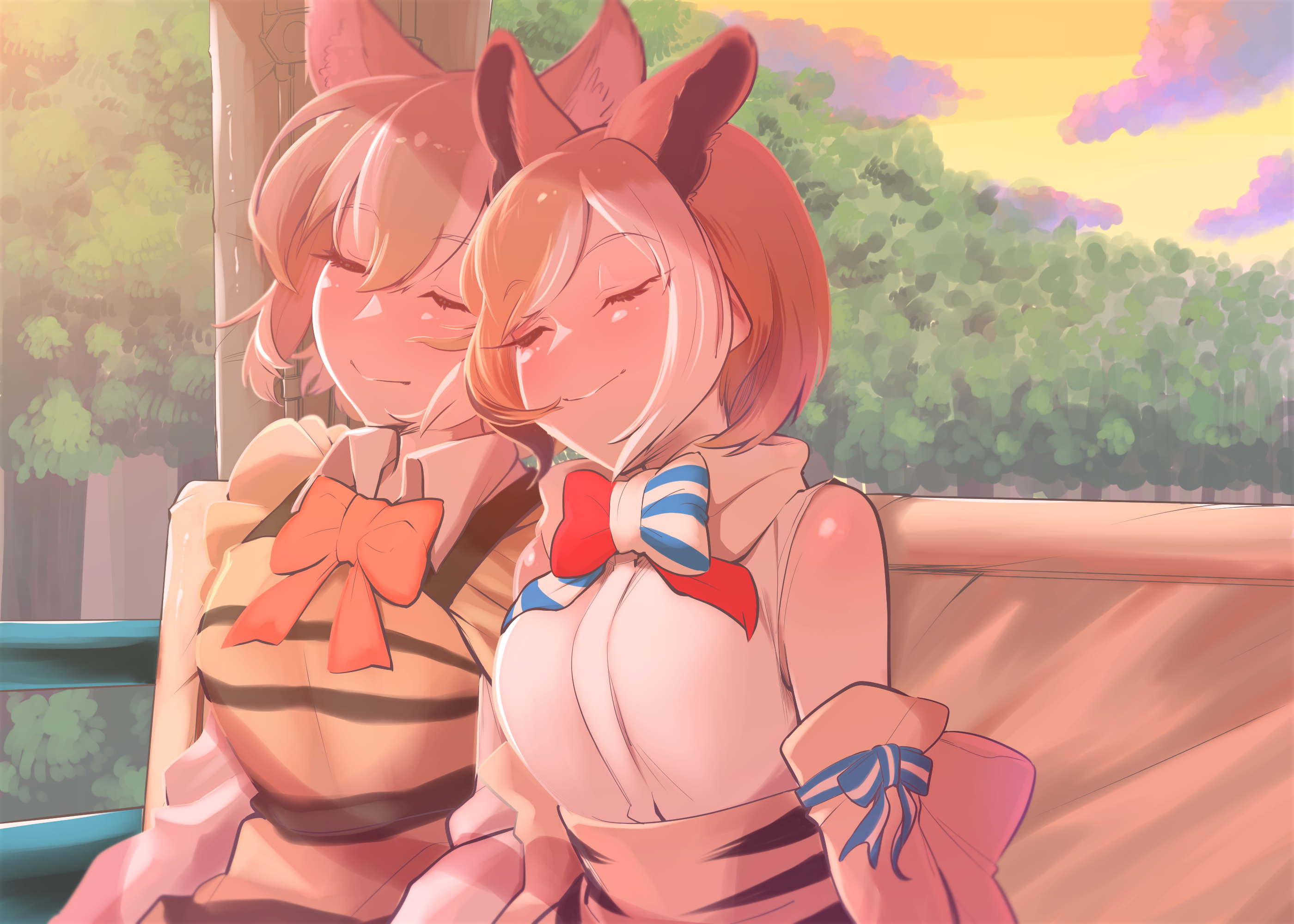 2girls animal_ears bow bowtie breasts closed_eyes closed_mouth collared_shirt commentary_request detached_sleeves extra_ears gm_(ggommu) highres kemono_friends leaning_on_person leaning_to_the_side light_brown_hair light_smile medium_breasts multicolored_hair multiple_girls partial_commentary shirt short_hair sitting sky sleeveless sleeveless_shirt spoilers sunset tasmanian_tiger_(kemono_friends) thylacine_(kemono_friends) tiger_stripes tree white_shirt yuri