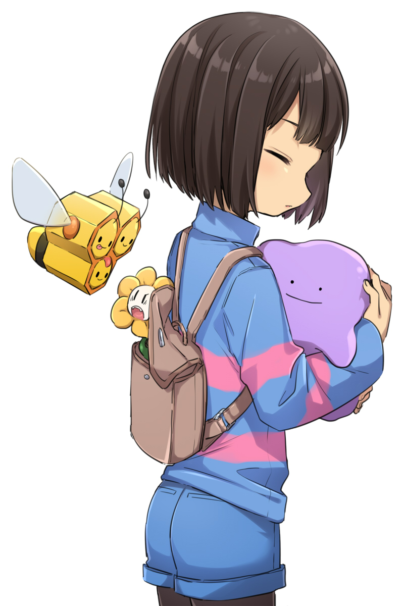 1other :p androgynous backpack bag black_pantyhose blue_shorts blue_sweater blunt_bangs blunt_ends blush bob_cut brown_bag brown_hair closed_eyes closed_mouth combee commentary cowboy_shot denim denim_shorts ditto double_horizontal_stripe expressionless flower flowey_(undertale) flying frisk_(undertale) from_behind from_side gen_1_pokemon gen_4_pokemon highres holding holding_pokemon in_bag in_container leftporygon light_blush long_sleeves nintendo open_mouth pantyhose parted_lips personification pink_sweater pokemon pokemon_(creature) short_hair short_shorts shorts shouting simple_background smile solo standing sweater tongue tongue_out turning_head turtleneck turtleneck_sweater two-tone_sweater undertale utdr_(toby_fox) white_background yellow_flower